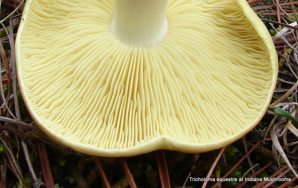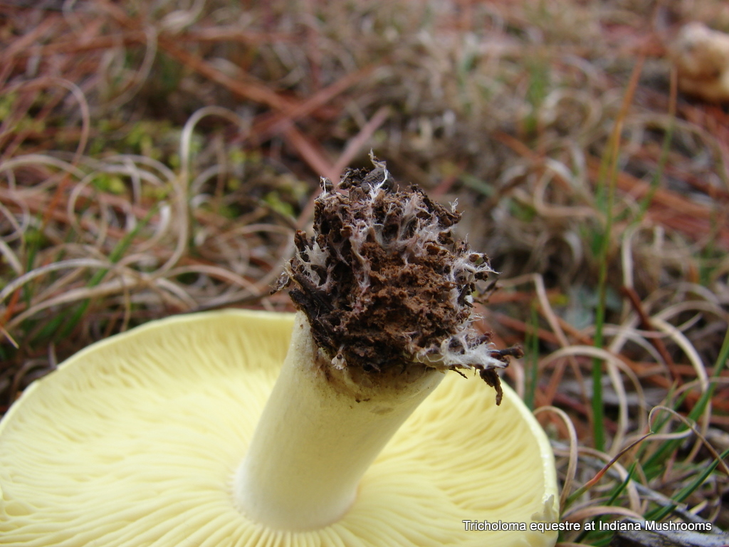 | Bright yellow gills are attached to the stem very slightly by a notch. The tiny white threads (mycelia) at the base are responsible for producing this mushroom. |