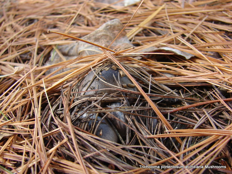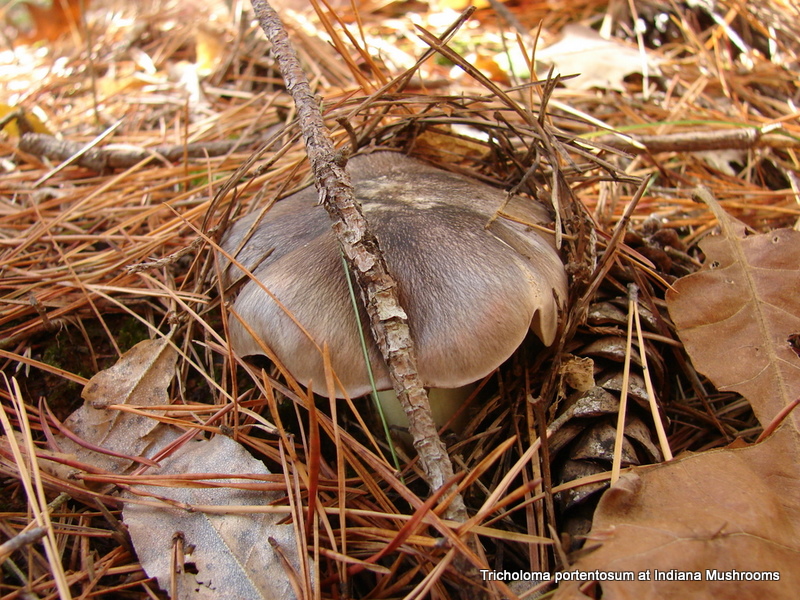| Called the Streaked Tricholoma or Sooty Head, this mushroom has a typically dark gray cap with fibrous streaks. Young caps often show yellow and/or purple tones near the margin; center of cap often black. Cap can be sticky or dry; up to 4 inches (10cm) across, average 2-3 inches. Gills and stem white overall, but usually show yellowish tints. White pine woods; November. |