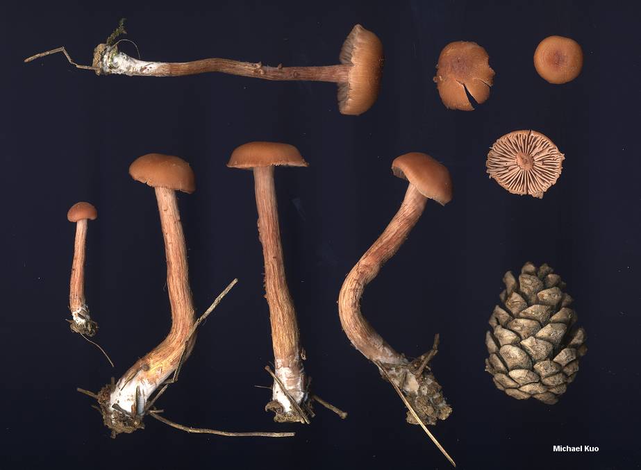 Laccaria proxima [ Basidiomycetes > Agaricales > Hydnangiaceae > Laccaria . . . ] by Michael Kuo Separating this species from the very similar Laccaria laccata requires a microscope; both species are variable enough in their macrofeatures that the differences visible to the naked eye are not definitive. In general, Laccaria proxima is a slightly more robust species, has a somewhat darker cap with a rougher texture, and never has a lined cap margin. Laccaria laccata, however, can be more robust than it typically is, can be darker than it should be, and often sports a somewhat roughened cap with a non-lined margin. While Laccaria proxima grows only under pines, Laccaria laccata grows just about anywhere, including pine forests. So, if your mushrooms were not growing under pines, they are not Laccaria proxima . . . but if they were, you will need to consult microscopic features: the spores of Laccaria laccata are round (or nearly so), and have fairly prominent spines; the spores of Laccaria proxima are mostly elliptical in outline, and have smaller, less prominent spines. Description: Ecology: Mycorrhizal with pines (Pinus species), especially in young plantations; growing scattered or gregariously; summer and fall; widely distributed in North America. Cap: 1.5-7 cm; convex, becoming flat and sometimes uplifted; the margin inrolled at first, later straight and not lined; at first finely roughened, later more prominently roughened or scaly; reddish brown to orange-brown. Gills: Attached to the stem; distant or nearly so; pinkish flesh color. Stem: 2.5-8 cm long; up to 1 cm thick; equal or with an enlarged base; finely or prominently hairy and fibrous-shaggy; colored like the cap (sometimes with a darker base); with white basal mycelium. Flesh: Thin; colored like the cap or paler. Odor and Taste: Not distinctive. Chemical Reactions: KOH negative on cap surface. Spore Print: White. Microscopic Features: Spores 8-11 x 7-9 µ; elliptical; spines mostly 0.5-1 µ long. Basidia 4-spored. Cheilocystidia filamentous to subclavate or subcapitate; to about 70 x 10 µ. Pileipellis a cutis of elements 5-10 µ wide, with occasional or frequent bundles of upright elements; terminal cells subclavate to capitate. REFERENCES: (Boudier, 1881) Patouillard, 1887. (Saccardo, 1891; Mueller, 1987; Phillips, 1991/2005; Mueller, 1997.) Herb. Kuo 09280305, 11020903. This site contains no information about the edibility or toxicity of mushrooms. |