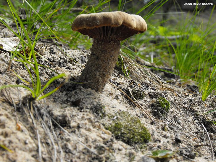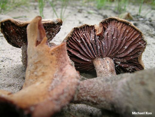 Laccaria trullissata [ Basidiomycetes > Agaricales > Hydnangiaceae > Laccaria . . . ] by Michael Kuo This interesting species of Laccaria can be found in sand dunes on the East Coast, the Gulf Coast, and along the Great Lakes. Its habitat and its thick, purple gills distinguish it from just about anything else--though if you are in eastern Canada, the similar sand-loving Laccaria maritima can only be reliably separated with a microscope (details below). Lacaria trullisata" (with one s) is a misspelling that has become virtually hegemonic. Laccaria maritima has whitish basal mycelium, and spores with the spiny ornamentation typical of the genus; it is recorded from the East Coast of Canada. Description: Ecology: Mycorrhizal, usually with pines (Pinus species); growing scattered or gregariously in sand dunes; late summer and fall; on the East Coast, the Gulf Coast, and along the Great Lakes. Cap: 2-7 cm; convex, becoming flat and sometimes depressed; the margin often inrolled, not lined; finely hairy to finely scaly or more prominently roughened; purplish when young but soon reddish brown, brownish, or buff. Gills: Attached to the stem; close or nearly distant; dark purple. Stem: 4-9 cm long; up to about 2.5 cm thick; usually with an enlarged base; hairy and often longitudinally lined; the surface frequently splitting near the apex; colored like the cap; with purplish basal mycelium that you are unlikely to see beneath the covering of sand; often nearly entirely submerged in the sand. Flesh: Pale purplish or whitish. Odor and Taste: Not distinctive. Spore Print: White. Microscopic Features: Spores 14-20 x 5.5-8 µ; elliptical or broadly spindle-shaped; roughened, but without the clearly defined, measurable spines typical of Laccaria species; inamyloid. Basidia 4-spored. Cheilocystidia absent or rare; when present filamentous. Pileipellis a cutis of elements 5-10 µ wide, with scattered bundles of upright elements; terminal cells subclavate to capitate. REFERENCES: (Ellis, 1874) Peck, 1912. (Saccardo, 1887; Smith, Smith & Weber, 1979; Weber & Smith, 1985; Lincoff, 1992; Mueller, 1997; Barron, 1999; Miller & Miller, 2006.) Herb. Kuo 09110411. This site contains no information about the edibility or toxicity of mushrooms. |