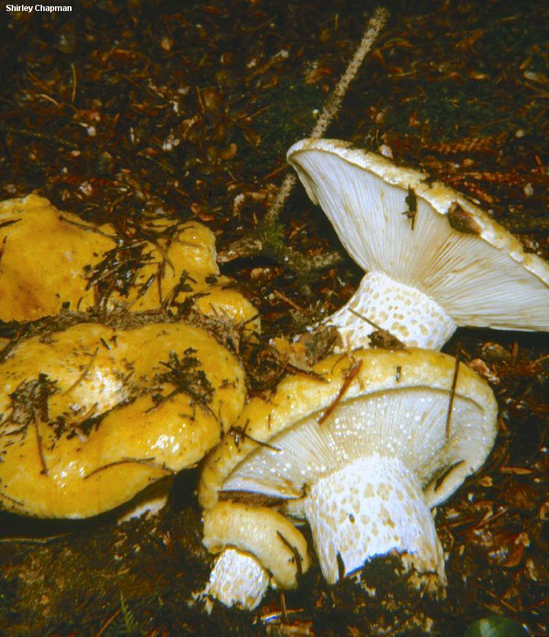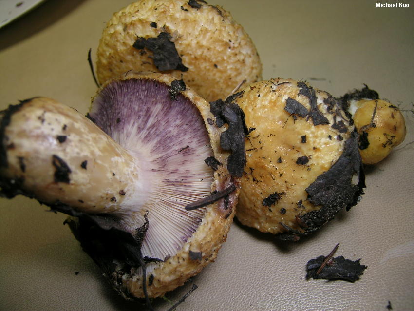 Lactarius repraesentaneus [ Basidiomycota > Russulales > Russulaceae > Lactarius . . . ] by Michael Kuo I can't imagine mistaking this mushroom for anything else. Found under spruces in northern and montane areas, it has a slimy, hairy, yellow cap that contrasts nicely with the purple bruises and stains created by handling the mushroom or damaging the gills. When fresh it has a distinctive, fragrant odor. The true Lactarius repraesentaneus is a European, spruce-associated species; whether or not our North American version is phylogenetically the same has not been determined, to my knowledge. The spores of the Colorado collections I have studied are substantially smaller than what is usually reported for the species by European sources—and by Hesler & Smith (1979), despite the fact that one of the collections I studied is cited by them. My friend Vera Evenson (author of Mushrooms of the Rocky Mountain Region, 2015) has also noted smaller-than-reported spore sizes for Colorado material. What about your collections? Let me know at if you have a well-documented, preserved Lactarius repraesentaneus collection for comparison! Thanks to Mila Visser 't Hooft for documenting, collecting, and preserving Lactarius repraesentaneus for study; her collection is deposited in The Herbarium of Michael Kuo. Thanks to the Sam Mitchel Herbarium of Fungi at the Denver Botanic Gardens for facilitating my study of several collections, and for permission to share with my readers Shirley Chapman's photo of the material in the fresh state; thanks also to Danila Romanov for sharing his photos of one of the collections. Description: Ecology: Mycorrhizal with spruces (in the southern Rocky Mountains it is fond of Engelmann spruce); summer and fall; widely distributed in northern and montane North America. The illustrated and described collections are from California and Colorado. Cap: 4–14 cm; convex with an incurved margin when young; becoming flat, shallowly depressed, or shallowly vase-shaped; slimy when fresh; hairy—especially at the margin, which is "bearded" when the mushroom is young; pale to dark yellow or orangish yellow; usually without concentric zones of color; often bruising lilac to purple when handled. Gills: Attached to the stem or beginning to run down it; close; short-gills frequent; sometimes forked near the stem; whitish at first, becoming yellowish or orangish; stained lilac to purple by the milk where damaged. Stem: 3–8 cm long; up to 3 cm thick; more or less equal, or slightly club-shaped; slimy when fresh; usually featuring potholes; whitish or pale yellowish; bruising and discoloring lilac to purple; becoming hollow; basal mycelium white. Flesh: White; changing to lilac when sliced. Milk: White; copious; staining tissues lilac to purple. Odor and Taste: Odor fragrant or not distinctive; taste usually bitter to acrid, but sometimes mild. Chemical Reactions: KOH red on cap surface. Spore Print: Creamy or yellowish. Microscopic Features: Spores 6.5–8 x 5.5–7 µm in the collection I have studied, but usually reported as somewhat larger (9–11 µm long); broadly ellipsoid to nearly subglobose; ornamentation as amyloid spines and connecting lines up to 0.5 µm high, often forming striped patterns and partial reticula (and sometimes nearly completely, though widely, reticulate). Hymenial cystidia fusiform, with long tapering necks that feature several apical constrictions; to about 90 x 10 µm. Pileipellis an ixocutis of elements 2.5–5 µm wide, golden in KOH. REFERENCES: Britzelmayr, 1885. (Saccardo, 1887; Hesler & Smith, 1979; Smith, Smith & Weber, 1979; Arora, 1986; States, 1990; Lincoff, 1992; Heilmann-Clausen et al., 1998; Kränzlin, 2005; McNeil, 2006; Miller & Miller, 2006; Evenson, 2015.) Herb. DBG 2696, CMS-2018-0388. Herb. Kuo 09221901. This site contains no information about the edibility or toxicity of mushrooms. |