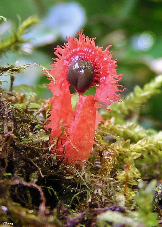 Laternea pusilla [ Basidiomycota > Agaricomycetes > Phallales > Clathraceae > Laternea . . . ] by Michael Kuo Here is a funky stinkhorn that is apparently limited to the Americas, from the Caribbean and Mexico southward. Like other stinkhorns it produces a spore-laden, foul smelling slime that attracts insects—but unlike any other species, it produces the slime on a specialized surface suspended between vaulted, crested, fringed arms. If you have seen The Lord of the Rings, this species is reminiscent of Sauron's Great Eye, suspended atop the evil tower, Barad-Dûr . . . except that Laternea pusilla is pink and tiny, maxing out at about 6 cm high, and the little tower sits peacefully in lush, green cloud forests instead of the desolation of Mordor. I have never collected Laternea pusilla, and I have never studied material collected by others. If you have found this amazing mushroom, I would love to make this page more scientific by studying your specimen! Please send me an email at if you would be interested in preserving the mushroom and sending it for study. Description: Ecology: Saprobic; growing alone or gregariously from moss-covered rotting wood or from forest debris near rotting wood; montane (4000-9000 feet); Mexico, Central America, the Caribbean, and South America; June through November. Immature Fruiting Body: A small, whitish "egg"; when sliced revealing the stinkhorn-to-be encased in a gelatinous substance. Mature Fruiting Body: A structure 2–6 cm high, composed of 2–3 (occasionally 4) unbranched, pinkish red to pink arms that are joined at the top in a corona-like arch. Arms: About 5 mm wide; in cross-section semicircular to circular; the edges prominently scalloped or, with maturity, tattered and fringed; spore slime dark brown, produced on a central, suspended structure under the apex of the arms; bases of arms free, but encased in a whitish volva; base attached to whitish or yellowish rhizoids. Microscopic Features: Spores 3–4 x 1–2 µm; cylindric; smooth; hyaline to yellowish. REFERENCES: Berkeley & Curtis, 1868. (Saccardo, 1888; Dring, 1980; López et al., 1982; Sáenz & Nassar, 1982; Sáenz et al., 1983; Calonge et al., 2004; Calonge et al., 2005; Trierveiler-Pereira et al., 2013; Trierveiler-Pereira, 2015.) I have not collected this mushroom. This site contains no information about the edibility or toxicity of mushrooms. |