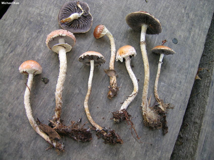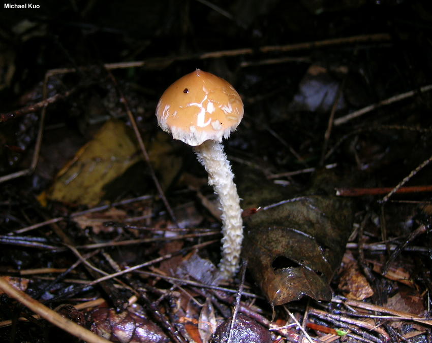 Leratiomyces squamosus var. thraustus [ Basidiomycota > Agaricales > Strophariaceae > Leratiomyces. . . ] by Michael Kuo This rare but gorgeous mushroom appears in eastern North America, decomposing woody debris on the forest floor under hardwoods or conifers. It is also documented from Washington and Utah. Leratiomyces squamosus var. thraustus has a sticky cap that is a beautiful shade of orange and, when young, is adorned with tattered white remnants of the partial veil. The ringed stem is shaggy with white scales, and becomes brownish as the mushroom matures. Under the microscope, Leratiomyces squamosus var. thraustus lacks chrysocystidia but features abundant cheilo-leptocystidia. Similar species are typically not as orange, differ in habitat, or have different microscopic characters. Leratiomyces squamosus var. squamosus has a yellow-brown to creamy yellowish cap; it is otherwise identical to Leratiomyces squamosus var. thraustus. If you are on the West Coast, be sure to compare Leratiomyces squamosus var. thraustus with Leratiomyces ceres, which grows in woodchips in urban settings, is more orange-red, and features chrysocystidia. Stropharia thrausta, Psilocybe thrausta, Stropharia squamosa var. thrausta, and Psilocybe squamosa var. thrausta are synonyms. Description: Ecology: Saprobic; growing alone or gregariously on woody debris in hardwood and conifer forests; summer and fall; widely distributed in eastern North America, and documented from Washington and Utah; uncommon. The illustrated and described collections are from Ohio and Kentucky. Cap: 2–5 cm; hemispheric at first, becoming broadly convex; sticky to slimy when fresh; bald; dull pinkish orange when young, maturing to bright orange; at first covered with a whitish, tissue-like covering that aggregates into scales as the cap expands; margin usually adorned with white partial veil remnants. Gills: Broadly attached to the stem; close or nearly distant; short-gills frequent; whitish to pale gray at first, becoming dark purplish gray; with whitish edges when mature. Stem: 8–15 cm long; up to 1 cm thick; more or less equal; dry; with a ring that is grooved on its upper surface and is usually arched gracefully downwards and away from the stem; fairly bald above the ring, but densely scaly below; white at first, becoming brownish toward the base with maturity; base with white mycelial threads. Flesh: White, becoming brownish in the stem with age; not changing when sliced. Odor and Taste: Not distinctive. Chemical Reactions: KOH on cap surface olive to negative. Spore Print: Dark purple-blackish. Microscopic Features: Spores 10–14 x 5–7 µm; ellipsoid; with a small pore; smooth; thick-walled; yellow-brown in KOH. Basidia 4-spored. Cheilocystidia as leptocystidia; 65–100 x 3–5 µm; cylindric-flexuous with rounded or subacute apices; smooth; hyaline to yellowish in KOH; thin-walled. Pleurocystidia not found. Pileipellis an ixocutis above a subcellular subpellis; orangish brown in KOH. REFERENCES: (Kalchbrenner, 1873) Bridge & Spooner, 2008. (Saccardo, 1887; Stamets, 1978; Smith, Smith & Weber, 1979; Guzman, 1983; McKnight & McKnight, 1987; Phillips, 1991/2005; Lincoff, 1992; Barron, 1999; Noordeloos, 1999; Roody, 2003; McNeil, 2006; Miller & Miller, 2006; Spooner et al., 2008; Kuo & Methven, 2014.) Herb. Kuo 10010413, 10101004. This site contains no information about the edibility or toxicity of mushrooms. |