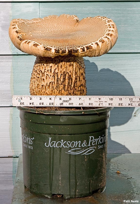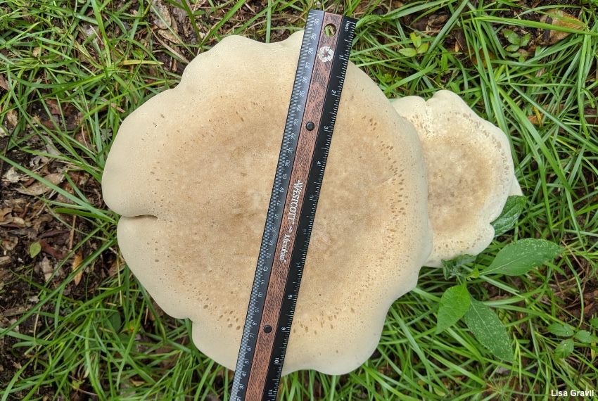 Macrocybe titans [ Basidiomycota > Agaricales > Callistosporiaceae > Macrocybe . . . ] by Michael Kuo There is a monster living in the southeastern United States and Mexico. It is probably the largest gilled mushroom in North America, with a cap that can measure over a yard across. It regularly appears in urban areas, causing considerable amazement. Believe it or not, there are a dozen or so gilled mushrooms in the world that get this large, most of which belong in the genus Macrocybe—Latin for "huge head." Macrocybe titans was originally described (as "Tricholoma titans") from grassy areas in northern Florida. Its defining features include the presence of bent-back scales on the stem, and, under the microscope, the presence of pseudocystidia on the faces of the gills. (However, the scales are not always prominent, and the pseudocystidia can be difficult to observe.) According to Pegler and collaborators (1998), the Costa Rican version of Macrocybe titans is unique in that it grows "from active Atta ant gardens" and has pseudocystidia on the edges (as well as the faces) of its gills. In a recent publication, Karlsen-Ayala and Smith (2020) hypothesize that Macrocybe titans may have been introduced to Florida from the Caribbean, and that it "has been spreading within the southeastern United States since its introduction," either naturally (through dispersal of spores on air currents) or with human assistance by way of woodchips and soil movement, along with warming climate. Thanks to Patti Neal and Lisa Gravil for collecting, documenting, and preserving Macrocybe titans for study; their collections are deposited in The Herbarium of Michael Kuo. Description: Ecology: Apparently saprobic; growing alone or, more often, gregariously or in loose clusters in grassy or sandy areas, or in ground disturbed by landscaping (usually in the year after the disturbance to the soil)—or, in Central America, growing from ant colonies; fall and winter; In North America distributed from Mexico to Texas, Florida, and the Carolinas; also found in Central America, the Caribbean, and South America. The illustrated and described collections are from Florida and South Carolina. Cap: 20–30 (reportedly up to 100) cm across at maturity; convex, becoming broadly convex or flat; dry; bald, but sometimes cracking in age or in dry weather; pale yellowish to brownish or buff; fading with age. Gills: Attached to the stem; crowded; short-gills frequent; white to pale brownish. Stem: 15–25 cm long; 8–14 cm thick; equal or slightly swollen; dry; whitish overall, with small, bent-back, brownish to whitish scales that become more prominent with age. Flesh: White; firm; not changing on exposure. Odor: Not distinctive. Spore Print: Reported as creamy white. Microscopic Features: Spores 5–7 x 4–5 µm; broadly ellipsoid; smooth; hyaline in KOH; inamyloid. Lamellar trama parallel. Basidia 4-sterigmate; 30–35 x 5–8 µm; clavate. Pseudocystidia scattered on gill faces, scarcely projecting; to 50 x 7.5 µm; fusiform to lageniform, with or without an extended neck; thin-walled; with refractive contents in KOH. Pileipellis a cutis of elements 2–5 µm wide. Clamp connections present. REFERENCES: (H. E. Bigelow & Kimbrough, 1980) Pegler, Lodge & Nakasone, 1998. (Bigelow & Kimbrough, 1980; Pegler, Lodge & Nakasone, 1998; Halling & Mueller, 2004; Bessette et al., 2007; Elliott & Stephenson, 2018; Karlsen-Ayala & Smith, 2020.) Herb. Kuo 10150702. This site contains no information about the edibility or toxicity of mushrooms. |