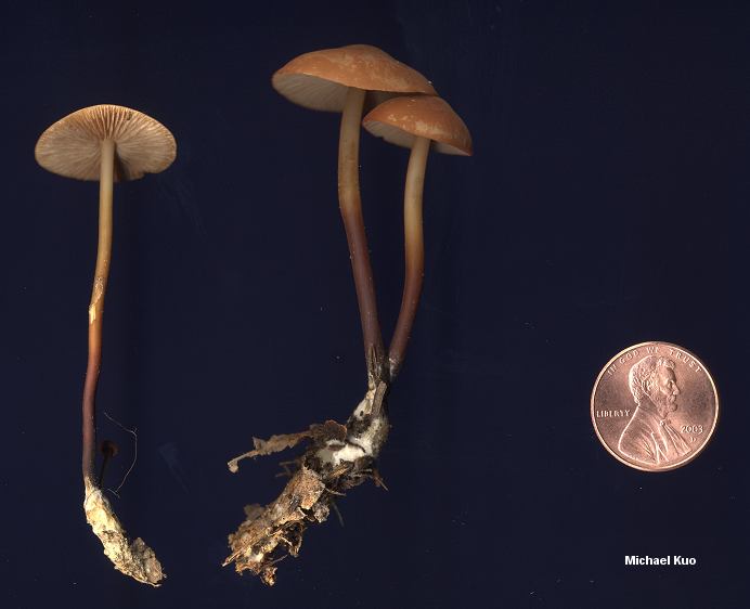 Marasmius cohaerens [ Basidiomycetes > Agaricales > Marasmiaceae > Marasmius . . . ] by Michael Kuo To the naked eye, Marasmius cohaerens is a bland, boring LBM (Little Brown Mushroom), partially distinguished by its white spore print and its darkening stem with white mycelium at its base. Under the microscope, however, the mushroom is completely transformed and becomes fascinating and unmistakable; it is covered with dramatic cystidia and "broom cells" (special cells with finger-like projections). In central Illinois Marasmius cohaerens is a late spring and early summer regular, though it also appears in late summer and fall. It is a diligent decomposer of leaf and twig litter in oak-hickory and beech-maple forests. Marasmius cohaerens var. lachnophyllus differs in having close or crowded gills; it is also more likely to be found on logs or twigs than Marasmius cohaerens proper, which usually decomposes leaf litter and humus. Other, more tentative differences in features can sometimes be used to separate these varieties; see Gilliam (1976). Description: Ecology: Saprobic on leaf litter and woody debris in hardwood forests (primarily oak-hickory and beech-maple woods, but also in hemlock forests where beech is present); growing alone or, more typically, in clusters of two or three (hence the species name cohaerens); early summer through fall; widely distributed in eastern North America. Cap: 1-3.5 cm across, convex, becoming broadly convex; smooth or somewhat wrinkled; the margin sometimes lined; yellowish brown to reddish brown, sometimes fading dramatically along the margin. Gills: Attached to the stem; distant or nearly so (but see comments below); pale at first, becoming tan, or even light brown; sometimes developing brown edges. Stem: 3-8 cm long; up to 3 mm thick; equal; dry; straight or slightly curved; whitish to yellowish brown at first, but soon darkening from the base up to dark brown or dark reddish brown; usually with copious, whitish basal mycelium. Flesh: Thin; insubstantial; pale. Odor and Taste: Taste mild or with a slightly bitter or acidic aftertaste; odor mild or pungent and unpleasant. Chemical Reactions: KOH on cap surface pale olive. Spore Print: White. Microscopic Features: Spores 7-10 x 3-5.5 µ; smooth; elliptical; inamyloid. Cystidia ("setae," according to authors who do not limit the term to non-gilled mushrooms) prominent, variously shaped but often fusiform; 20-110 µ long; with thick (to 3 µ) walls; dextrinoid. Broom cells present on gills and cap surface. REFERENCES: (Albertini & Schweinitz) Cooke & Quélet, 1878. (Persoon, 1801; Fries, 1821; Saccardo, 1887; Kauffman, 1918; Gilliam, 1976; Smith, Smith & Weber, 1979; Phillips, 1991/2005; Lincoff, 1992; Barron, 1999; Halling & Mueller, 2005; McNeil, 2006.) Herb. Kuo 08270205, 05290401, 07040701, 06160801. This site contains no information about the edibility or toxicity of mushrooms. |