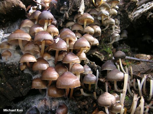 Mycena semivestipes [ Basidiomycetes > Agaricales > Tricholomataceae > Mycena . . . ] by Michael Kuo This little mushroom is one of dozens of nondescript, brownish Mycena species--but it has just enough distinctive features to separate it from the monotonous masses. It grows in very dense clusters on the wood of hardwoods in eastern North America, and features a convex to planoconvex cap. The odor is usually bleach-like (crush a cap between your fingers), and the mature stem is pale above, but brown or nearly black below. The gills are attached to the stem, or feature a tiny "tooth" that runs down the stem's apex. Under the microscope, Mycena semivestipes has very small spores and characteristic cystidia (see below). Most authors list Mycena semivestipes as a fall and winter species, but I have also collected it during a cold spell in June. Description: Ecology: Saprobic on the deadwood of hardwoods; causing a white rot; usually growing in dense clusters; fall and early winter (but I have collected it in a summer cold spell); widely distributed east of the Great Plains. Cap: 1-3.5 cm across; convex, becoming broadly convex or nearly flat; sticky when fresh; smooth; dark brown or nearly black, fading to brown or grayish but retaining a darker center; greasy when fresh; sometimes with reddish tones in wet weather; the margin lined. Gills: Attached to the stem, beginning to run down the stem, or attached with a "tooth" that begins to run down the stem; close; white, or pinkish with age; sometimes developing reddish brown spots. Stem: 2-6 cm long; 1-3 mm thick; fairly tough; equal; usually finely fuzzy near the base, at least when young; pale near the apex; brown to blackish near the base. Flesh: Insubstantial; pallid or brownish. Odor and Taste: Odor bleach-like, but sometimes indistinct in buttons. Taste unpleasant or slightly bitter. Chemical Reactions: KOH negative on cap surface. Spore Print: White. Microscopic Features: Spores 4-5 x 2.5-3 µ; weakly to moderately amyloid, or inamyloid when mature; elliptical; smooth. Pleurocystidia and cheilocystidia similar; to about 40 x 15 µ; club-shaped, broadly fusoid-ventricose, saccate, or irregular; sometimes developing vague projections or lobes; inconspicuous and often hard to distinguish from basidioles. REFERENCES: (Peck, 1895) Smith, 1947. (Bessette, Miller, Bessette & Miller, 1995; McNeil, 2006.) Herb. Kuo 06140306, 10310903. This site contains no information about the edibility or toxicity of mushrooms. |