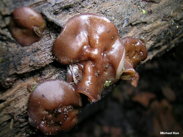 Pachyella punctispora [ Ascomycetes > Pezizales > Pezizaceae > Pachyella . . . ] by Michael Kuo Recorded from Michigan, New York, and Illinois (and now Kentucky, if I have identified it correctly), this rubbery brown cup fungus requires microscopic analysis to separate from the more commonly collected Pachyella clypeata. While Pachyella clypeata has smooth spores, the spores of Pachyella punctispora, as its Latin name suggests, are stippled with warts. The warts, however, are not large (separating Pachyella punctispora from Pachyella adnata, which has warts measuring over 1 µ). Description: Ecology: Saprobic; growing alone or in small groups on rotting wood (primarily the wood of hardwoods) that is usually water-soaked; spring, summer, and fall; distribution uncertain (recorded from Illinois, Michigan, and New York by the author of the species; my collection was made in eastern Kentucky). Fruiting Body: To 3 cm across; cushion-shaped when young, soon becoming saucer-shaped or shaped like a flattened cup; broadly attached to the wood so that only the edges can be lifted away from the substrate; upper surface sticky when fresh, medium to dark brown, often with hints of purple, smooth or wrinkled, fading with age; without a stem; flesh somewhat rubbery or gelatinous when fresh. Microscopic Features: Asci with bluish tips in Melzer's reagent; 400-450 x 19-25 µ. Spores 21-25 x 12-15 µ; with one or two oil droplets; stippled with tiny warts (unmeasurable with light microscopy); in my collection the warts visible with a 2% KOH mount as well as with tap water and with Melzer's Reagent. Excipular surface with a few thread-like elements that do not create a palisade. REFERENCES: Pfister, 1973. (Pfister, 1973.) Herb. Kuo 10150401. This site contains no information about the edibility or toxicity of mushrooms. |