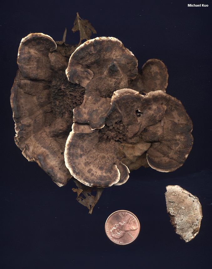 Phellodon confluens [ Basidiomycetes > Thelephorales > Bankeraceae > Phellodon ... ] by Michael Kuo This toothed mushroom is found under hardwoods or conifers in eastern North America. Its cap is velvety and tan to brown, with a whitish margin--and it often fuses with other caps to create gnarled-looking masses. The spore print is white, and the odor is reminiscent of curry or burned maple syrup, especially when the mushrooms are dried. Description: Ecology: Mycorrhizal with hardwoods or conifers; growing alone or gregariously; summer and fall; widely distributed in eastern North America. Cap: Single or (frequently) fused with other caps; 3-13 cm wide; planoconvex, becoming flat or shallowly depressed; velvety; sometimes pitted or roughened; often with vague zones of color or texture, but not strongly zonate; whitish to pale grayish on the growing margin, becoming tan to brown toward the center; bruising dark brown to blackish. Undersurface: Running down the stem; covered with crowded spines that are 1-2 mm long; whitish at first, becoming brownish. Stem: 1-4.5 cm long; .5-1 cm thick; smooth or finely velvety; colored like the cap. Flesh: Whitish to pale grayish or brownish; sometimes arranged in vague zones of these shades. Odor and Taste: Odor mild or, more commonly, fragrant (reminiscent of curry or maple syrup), becoming stronger when dried; taste mild. Chemical Reactions: KOH on flesh olive, then brown to black. Spore Print: White. Microscopic Features: Spores 3.5-6 x 3-4 µ; globose to subglobose; echinulate with spines about .5 µ long. Clamp connections absent. REFERENCES: (Persoon, 1825) Pouzar, 1956. (Coker & Beers, 1951; Smith, Smith & Weber, 1981; Baird, 1986.) Herb. Kuo 09130411 Phellodon amicus and Phellodon vellereus are synonyms. Further Online Information: Phellodon confluens at Roger's Mushrooms |