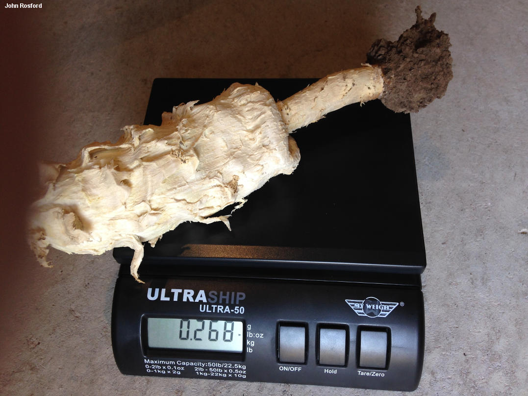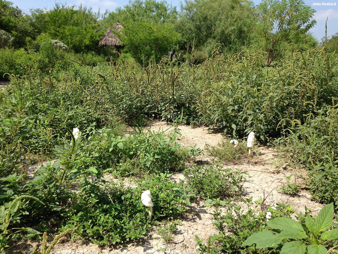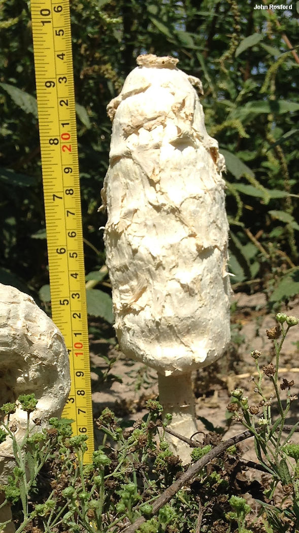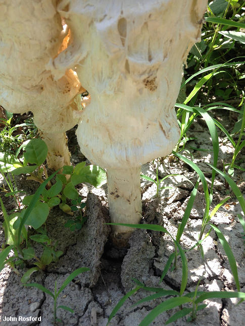 Podaxis longii [ Basidiomycota > Agaricales > Agaricaceae > Podaxis . . . ] by Michael Kuo Podaxis longii is an amazing desert mushroom, thrusting itself up to nearly 20 inches high on a thick, woody stem. In many ways it is reminiscent of Coprinus comatus, the well-known "shaggy mane," but it is larger and tougher than that species, and does not feature well-formed gills; instead, it has an irregular puffball-like interior that eventually turns into spore dust and disintegrates. It is closely related to the better known and more widely distributed Podaxis pistillaris, which also appears in arid ecosystems, but that species is significantly smaller and features larger spores. Although it was officially described in 1985 (McKnight), Podaxis longii was recognized in an unofficial way by Long in the early 20th Century; McKnight used the epithet longii to recognize Long's earlier, unofficial contribution. A 2001 treatment of Podaxis argentinus in Argentina by Dios and collaborators, in my opinion, actually describes Podaxis longii, given the robust dimensions and microscopic characters of the described collections (and given the fact that the authors were apparently unfamiliar with McKnight's earlier Podaxis publications, since they are not mentioned or cited). McKnight reports Podaxis longii from Argentina. Thanks to John Rosford for collecting, documenting, and preserving Podaxis longii for study; his collection is deposited in The Herbarium of Michael Kuo. Description: Ecology: Presumably saprobic; growing alone, scattered or in small troops in arid, desert settings--including wasteland, fields, and urban locations; spring through fall (but tough, and sometimes lasting over winter); southern California, southern Arizona, and Texas; also recorded from Argentina, and therefore probably to be expected in the arid regions of Mexico and Central America. The illustrated and described collection is from southern Texas. Cap: 8-18 cm high and 4-8 cm across at maturity; oval when very young, but soon more or less cylindric, with a rounded apex; shaggy to scaly; sticky when fresh, but soon dry; white to whitish or pale brownish; the margin tucked under and attached to the stem. Interior: Ranging from fairly solid and marbled in appearance to being composed of vaguely gill-like, contorted plates; at first whitish but soon brownish and eventually reddish brown; at maturity turning into brown powder. Stem: 8-20 cm long; up to 3 cm thick at apex; more or less equal above a swollen base that is usually buried and rooted in the sand; extremely tough and woody; coarsely fibrillose to scaly; sticky when fresh, but soon dry; whitish to brownish; without a ring; in old age sometimes remaining after the cap and spore mass have deteriorated. Flesh: Tough; whitish. Odor and Taste: Odor not distinctive. Spore Print: Not obtainable as a "spore print," but mature specimens shed brown to orangish or reddish brown spore powder profusely. Microscopic Features: Spores 6-10 (-13) x 6-8 µ; subglobose to broadly ellipsoid or irregular in outline; very thick walled; hyaline to brownish in KOH; yellowish to brownish in water; with a shallow, wide (1-2 µ), elliptical pore; rarely with a very tiny (under 0.5 x 0.5 µ), stublike sterigma. Capillitium thick-walled. REFERENCES: McKnight, 1985. Herb. Kuo 07171401. This site contains no information about the edibility or toxicity of mushrooms. |