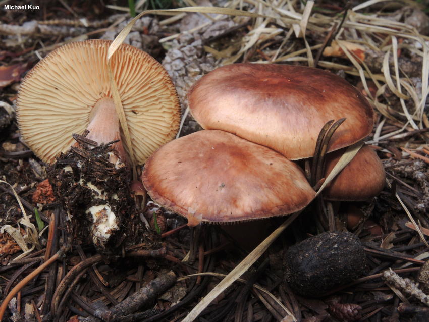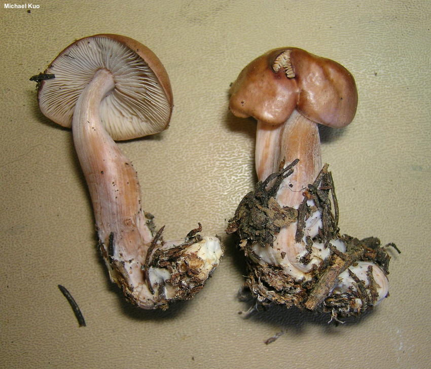 Rhodocollybia butyracea [ Basidiomycota > Agaricales > Omphalotaceae > Rhodocollybia . . . ] by Michael Kuo Rhodocollybia butyracea is a widespread decomposer of conifer debris, usually found under pines (species of Pinus, with bundled needles). It is very similar to Gymnopus dryophilus, but it tends to have a reddish brown, rather than yellow-brown, cap. Additionally, its stem is frequently somewhat club-shaped and its gills are often finely jagged--features not usually found in the straight-stemmed, even-gilled Gymnopus dryophilus. Some sources emphasize a difference in spore print color (pinkish for Rhodocollybia butyracea; white for Gymnopus dryophilus), but the difference, which is minimal at best, requires a very thick spore print, natural lighting, and good eyes. The best means of separating the two species is microscopic; Rhodocollybia butyracea features dextrinoid, rather than inamyloid, spores. DNA analysis by Mata and collaborators (2004) revealed at least two genetically distinct populations within "Rhodocollybia butyracea"; further research may determine that there is more than one species involved. In 2004, Mleczko identified Rhodocollybia butyracea mycelium on rootlets of Scots pine in Poland, using RFLP analysis (an early DNA-reading method, since replaced by sequencing). Mleczko described what he assumed were the ectomycorrhizae of the fungus and presented the idea that Rhodocollybia butyracea is mycorrhizal. However, later researchers (Tedersoo et al., 2010) suggest that Mleczko's methods may have led to an inaccurate conclusion, and argue that the fungus is a saprobe. Collybia butyracea is a former name. Description: Ecology: Saprobic (see discussion above); decomposing the litter of conifers—especially pines; late summer and fall (also winter and spring in warmer climates); fairly widely distributed in North America. The illustrated and described collections are from Colorado and Illinois. Cap: 2–6 cm across; convex, becoming broadly convex or nearly flat; moist, with a greasy feel, when fresh; bald; reddish brown to brown, fading to cinnamon. Gills: Narrowly attached to the stem or nearly free from it; close; short-gills frequent; whitish; often developing finely jagged edges. Stem: 3–8 cm long; and 1–2 cm thick; usually slightly to moderately club-shaped; moist or dry; bald; whitish to buff above; colored like the cap below; often with a whitish dusting when fresh; becoming hollow; basal mycelium white. Flesh: Whitish; unchanging when sliced. Odor and Taste: Not distinctive. Chemical Reactions: KOH gray on cap surface. Spore Print: Whitish or, with a thick print, faintly pinkish. Microscopic Features: Spores smooth; 8–10 x 4.5–6 µm; ellipsoid; smooth; hyaline in KOH; at least a few (often many) dextrinoid. Basidia 4-spored. Pleurocystidia not found. Cheilocystidia inconspicuous; subclavate to subcylindric; often lobed or with projections; up to 40 µm long. Pileipellis a cutis; elements 2.5–7.5 µm wide, smooth or brownish-encrusted, clamped at septa. REFERENCES: (Bulliard, 1792) Lennox, 1979. (Fries, 1821; Saccardo, 1887; Kauffman, 1918; Coker & Beardslee, 1921; Smith, Smith & Weber, 1979; Vilgalys & Miller, 1982; Halling, 1983; Arora, 1986; Phillips, 1991/2005; Barron, 1999; Mata et al., 2004; Mleczko, 2004; McNeil, 2006; Miller & Miller, 2006; Trudell & Ammirati, 2009; Antonín & Noordeloos, 2010; Tedersoo et al., 2010; Kuo & Methven, 2014; Desjardin, Wood & Stevens, 2016; Evenson, 2016; Siegel & Schwarz, 2017.) Herb. Kuo 08120701, 08021705, 11041705. Herb. DBG RMNP 2009-025, RMNP 2012 5023-04. This site contains no information about the edibility or toxicity of mushrooms. |