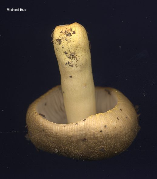 Russula pulverulenta [ Basidiomycetes > Russulales > Russulaceae > Russula . . . ] by Michael Kuo You might easily pass this mushroom by, thinking that it is just another boring, brownish to straw-colored russula. Close inspection, however, reveals Russula pulverulenta to be fairly distinctive--though some might still argue it's boring. What distinguishes this mushroom from many similar russulas is a layer of dense yellowish granules on the young caps; as the mushroom matures and the cap expands, the yellow material breaks up to form soft, yellowish patches, which are scattered across the cap surface. What, exactly, the powdery granules and scales of Russula pulverulenta are, or what "function" they are serving, is not completely clear. Typically, such things occur on mushroom caps either because the cap grows too fast to maintain the surface it had as a button--or because there was a universal veil covering the young mushroom. In Russula pulverulenta, the break-up of the layer of granules into soft patches is obviously caused by the expansion of the cap . . . but what was the layer doing there in the first place? Singer (1962) believed that this mushroom and the similar Russula granulata (see comments below) actually had veils, making them extremely rare among russulas. Shaffer (1972), however, analyzed the cell structure of the patches and found them to be closely aligned with the cells of the cap surface, perhaps refuting the veil explanation. If you're thinking, "And I care because . . . ?" I don't blame you. I thought it was kind of interesting, but then again, I'm a mushroom geek. You are of course welcome to throw your Russula pulverulenta at my head to see if any "interesting" break-up of floccose patches occurs there, too. Russula granulata is a very similar species that features a more crust-like, darker covering on the cap; under the microscope the crust-like material is composed of smooth, colorless or brownish cells--as opposed to the yellow, warty cells comprising the patches on Russula pulverulenta. Description: Ecology: Mycorrhizal with hardwoods or conifers; sometimes found in urban settings; growing alone (usually so, in my collecting experience), scattered, or gregariously; summer and fall; widely distributed east of the Rocky Mountains. Cap: 3.5-8 cm; convex with an inrolled margin when young, becoming broadly convex to flat with a shallow depression, with a more or less straight margin that is prominently grooved and pimply; dry or slightly moist; when young covered by a dense layer of orange-yellow to yellow material which eventually breaks up to form loose patches that often wear off with age; dark grayish brown to yellowish brown; the skin peeling away easily at the margin, sometimes about halfway to the center. Gills: Attached to the stem; close or almost distant; not generally forking, or occasionally forking near the stem; white; sometimes discoloring brownish to yellowish in age. Stem: 3.5-5 cm long; 1-2 cm thick; when young white, overlaid with yellow granules; later whitish towards the top and yellowish below; sometimes discoloring yellowish brown with age; dry; often becoming cavernous; fairly smooth. Flesh: White to pale yellowish; unchanging when sliced; olive to olive brown around worm holes. Odor and Taste: Odor sweet and fragrant, or slightly foul, or in some cases absent; taste slightly to moderately acrid. Chemical Reactions: KOH on cap surface orange to orangish or negative. Iron salts on stem surface negative. Spore Print: Creamy. Microscopic Features: Spores 6-8 x 5-7 µ; with warts .4-1.2 µ high; broadly elliptical or nearly round; connecting lines scattered, occasionally forming partial reticula. Pleurocystidia positive in sulphovanillin. Pileocystidia absent. Floccose patches on cap and stem composed of warty, septate hyphae that are yellow in a water mount (avoid KOH, which dissolves the warts). REFERENCES: Peck, 1902. (Saccardo, 1905; Burlingham, 1915; Beardslee, 1918; Kauffman, 1918; Shaffer, 1972.) Herb. Kuo 09010203, 10060501, 08310701. This site contains no information about the edibility or toxicity of mushrooms. |