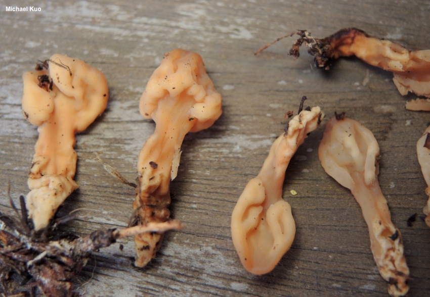 Spathularia flavida var. ramosa [ Ascomycota > Rhytismatales > Cudoniaceae > Spathularia ... ] by Michael Kuo Found in the Rocky Mountains, this interesting mushroom is currently passing as Spathularia flavida, but it is pretty clearly distinct from both the originally named European version of that species and some North American versions, which feature a pale yellow to white stem and a clear yellow, usually-flattened head—as opposed to the brownish orange to orangish stem and the dull orangish, usually three-dimensional head of the Rocky Mountain version. In 1955 Mains named Spathularia flavida var. ramosa, designating a collection made in Idaho by Smith and Bigelow as the type collection; Mains said the variety differed from the typical variety in its paraphyses, which were "much branched above," and in the shape of the fruiting bodies, which "show considerable variation from typical spathulate to a clavate, slightly flattened condition." Bigelow's notes in the collection box describe a "clavate, pale pinkish buff" head and provide an identification of "Microglossum?"; the suggestion of Microglossum over Spathularia further supports the idea that the mushroom in question is often three-dimensionally club-shaped. While mycologists since Mains have tended to collapse var. ramosa into synonymy with a broadly-conceived Spathularia flavida, I have resurrected the name here to point out substantial differences in morphology; I suspect that a separate species should be named for the Rocky Mountain entity. Description: Ecology: Presumably saprobic; growing gregariously or in clusters under conifers in needle duff; late summer; Rocky Mountains. The illustrated and described collection is from Colorado. Fruiting Body: Roughly club-shaped, with an irregular, sometimes-flattened head portion at the top of a stem. Head 10–30 mm across; 10–30 mm high; irregular in shape but usually more or less club-shaped, varying to somewhat flattened; dull orangish; bald and often slightly wrinkled; moist when fresh. Stem 10–20 x 2–5 mm; more or less equal; bald; dull orangish to orangish brown; becoming hollow; attached to whitish mycelium. Flesh insubstantial; orangish. Odor not distinctive. Microscopic Features: Spores 65–80 x 1–2 µm; aciculate; often slightly curved; smooth; hyaline and multiguttulate in KOH. Asci 120–130 x 12–14 µm; fusiform; hyaline in KOH. Paraphyses 120–150 x 1–2 µm; cylindric; septate; often branching; flexuous; apices rounded or subclavate; often curving, hooking, or curling past the asci; smooth; hyaline in KOH. REFERENCES: Mains, 1955. (Cripps, Evenson & Kuo, 2016.) Herb. Kuo 08141505. This site contains no information about the edibility or toxicity of mushrooms. |