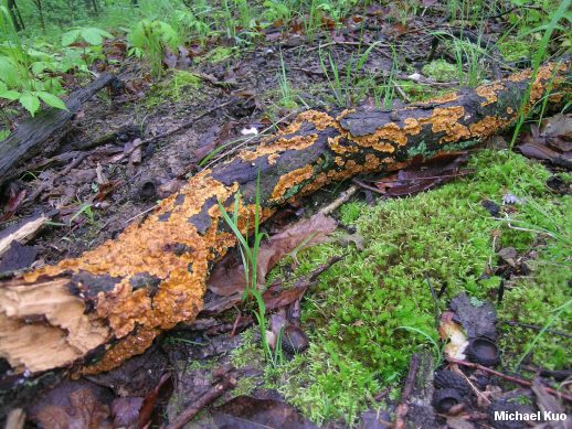 Stereum complicatum [ Basidiomycetes > Russulales > Stereaceae > Stereum . . . ] by Michael Kuo In the oak-hickory forests of central Illinois, Stereum complicatum competes with Gymnopus dryophilus and Ganoderma applanatum to be the most common, ubiquitous, ever-present, lost-all-its-luster fungus among us. Distinguishing features include the orange colors; the smooth underside that lacks pores; and the small, often fused fruiting bodies. It is very close in appearance to Stereum hirsutum, but that species is yellow and brown, and slightly larger (however, specimens "intergrading" between the classic forms of Stereum complicatum and Stereum hirsutum are not uncommon, and some mycologists treat them as versions of the same species). Stereum rameale is a synonym. Stereum complicatum, Stereum hirsutum, Stereum gausapatum, Stereum styracifluum, and Stereum versicolor are all members of the Stereum hirsutum group, and are considered forms or varieties of Stereum hirsutum by some mycologists. Description: Ecology: Saprobic on the dead wood of hardwoods, especially oaks; growing densely gregariously, often from gaps in the bark; fusing together laterally; causing a white rot of the heartwood; often serving as a host to algae; sometimes parasitized by jelly fungi; spring, summer, fall, and winter; widely distributed in North America but apparently absent in the Rocky Mountains. Fruiting Body: Individually up to about 2 cm across, but usually fused together; fan-shaped, semicircular, irregular--or not infrequently resupinate (lacking a cap structure) to effused-reflexed (resupinate with a folded over edge); densely velvety, hairy, or with appressed hairs (sometimes nearly smooth in age); with concentric zones of color and texture; colors ranging from tan to orange-brown, pinkish, or cinnamon; laterally attached, without a stem. Undersurface: Smooth; orange. Flesh: Insubstantial; tough. Chemical Reactions: KOH red (or at first red, then black) on upper surface. Spore Print: White; difficult to obtain. Microscopic Features: Spores 5-7.5 x 2-3 µ; smooth; cylindric; amyloid. Hyphidia with rounded to subacute apices; without projections (pseudoacanthohyphidia and acanthohyphidia absent). REFERENCES: (Fries, 1828) Fries, 1838. (Saccardo, 1888; Welden, 1971; Chamuris, 1985; Phillips, 1991/2005; Lincoff, 1992; Metzler & Metzler, 1992; McNeil, 2006; Miller & Miller, 2006; Binion et al., 2008.) Herb. Kuo 04270708, 05040705. This site contains no information about the edibility or toxicity of mushrooms. |