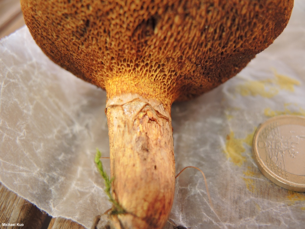 Suillus tridentinus [ Basidiomycota > Boletales > Suillaceae > Suillus . . . ] by Michael Kuo Look for Suillus tridentinus under European larch in the Alps and the Carpathians. Its orange cap and pore surface make it fairly easy to distinguish. On the stem there is a collapsing whitish ring and an orange, reticulate apex. The cap surface usually features scattered fibrillose patches, especially near the margin. Compare Suillus tridentinus with other European larch-associated Suillus species: Suillus viscidus features a gray to pale grayish brown cap, and a whitish pore surface; Suillus bresadolae features a gray pore surface and a reddish brown cap; Suillus grevillei has a dry cap ranging from yellow to brownish red, and a bright yellow pore surface composed of smaller, rounder pores. Finally, Suillus tridentinus flavogriseus, sometimes called Suillus nueschii, features a yellow cap and stem with a whitish veil. Description: Ecology: Mycorrhizal with European larch; growing alone or gregariously; fall; originally described from Italy; probably widespread in the Alps and the Carpathians, throughout the natural range of the host tree. The illustrated and described collection is from Italy. Cap: 5–9 cm across; broadly convex; sticky when fresh; bald, or with fibrillose areas, especially near the margin; brownish orange to orange; staining waxed paper yellow. Pore Surface: Bright orange when young, becoming duller orange with maturity; pores large and angular, about 1–2 mm in length, in boletinoid (radial) arrangement; tubes to about 10 mm deep. Stem: 4–6 cm long; 1–2 cm thick; more or less equal above a tapered base; colored like the cap; with a collapsing, gelatinized, whitish ring; often reticulate above the ring; basal mycelium whitish. Flesh: Pale yellow to orangish in cap and upper stem; darker yellow or orange in stem base; when sliced sometimes turning a little bluish in lower stem. Odor and Taste: Not distinctive. Microscopic Features: Spores 8–14 x 3.5–5 µm; boletoid-fusiform; smooth; yellowish in KOH. Basidia 20–25 x 4–6 µm; subclavate; 4-sterigmate. Cystidia mostly in bundles; 30–50+ x 5–10; cylindric with subclavate, subcapitate, or merely rounded apices; thin-walled; smooth; hyaline to brown in KOH. Pileipellis an ixocutis. Clamp connections not found. REFERENCES: (G. Bresàdola, 1881) R. Singer, 1945. (Phillips, 1981; Moser, 1983; Bruns & Palmer, 1989; Breitenbach & Kränzlin, 1991; Nonis, 2007; Buczacki et al., 2013; Klofac, 2013; Knudsen & Taylor, 2018; Noordeloos, 2018; Læssøe & Petersen, 2019; Kibby, 2020.) Herb. Kuo 09221802. This site contains no information about the edibility or toxicity of mushrooms. |