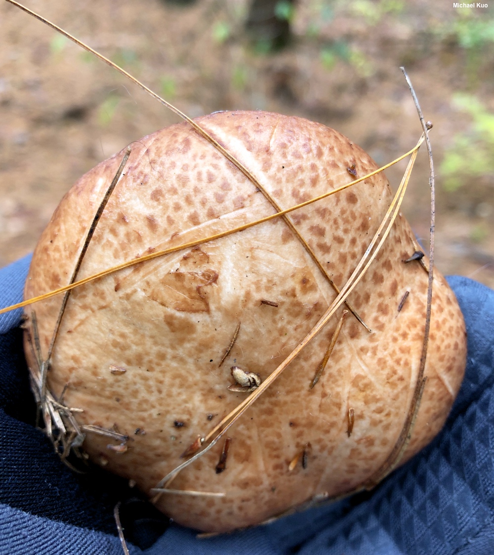 Suillus weaverae [ Basidiomycota > Boletales > Suillaceae > Suillus . . . ] by Michael Kuo This species is strictly associated with eastern white pine, and is the eastern North American "Suillus granulatus" found in virtually every American field guide (including those written by me). Research by Nhu Nguyen and collaborators (2016) supports the idea that the true Suillus granulatus is a European associate of hard pines (species of Pinus with needles bundled in twos and/or threes), possibly imported in some North American locations along with their pine hosts—while the species North Americans have been calling "Suillus granulatus" is associated with a soft (5-needled) pine and is actually not even particularly closely related to Suillus granulatus, despite its close resemblance. Suillus weaverae features a reddish- to orangish-brown, sticky cap that often develops a patchwork pigment pattern, along with small, contrasting glandular dots on the stem surface. There is no ring on the stem, nor any partial veil remnants on the cap, and the dull yellow pore surface features smallish pores that are not strongly boletinoid. Since this description applies equally to Suillus granulatus, the association with eastern white pine is an essential identification character. In fact the appearance of Suillus weaverae changes pretty drastically over the course of development. Young specimens can have dark reddish brown caps, a white pore surface, white flesh, and inconspicuous glandular dots—while old specimens have tan caps, yellow pores and flesh, and fairly conspicuous glandular dots. Under the microscope, the pileipellis elements of young specimens can be hard to view due to globules of pigment, while in older specimens these globules have disappeared. Very old specimens of Suillus weaverae are mushy and brown, and may well get the award for Most Disgustingly Splatty Boletes Ever. "Suillus lactifluus," as it has been interpreted in North America, is a synonym for Suillus weaverae (in Europe it is a synonym for Suillus granulatus). The name was formerly applied to a form possessing a stem that is more yellow in youth, glandular dots that do not darken as much, and a young pore surface frequently beaded with milky droplets; these characters, however, fall within the range of Suillus weaverae's (and Suillus granulatus's) variability—and Nguyen and collaborators (2016) found no DNA support for separating specimens identified as Suillus lactifluus. For those who care about such things, Suillus weaverae was initially described by Smith & Shaffer (1965) based on a collection and accompanying notes sent to them from "Mrs. Paul H. Weaver, of Faribault, Minnesota." Based on the color of the spore print they placed the collection in the now-synonymized-with-Suillus genus "Fuscoboletinus," and also misinterpreted a white filmy coating on the pore surfaces and sheathing the stems as a partial veil—when in fact it was a Hypomyces infection beginning to spread across the Suillus. Thus the new "species" was really just a collection of what was then called Suillus granulatus in North America, and the type collection, when sequenced by Nguyen and collaborators, turned out to be the same species as other granulatus-like, white-pine-associated collections from eastern North America. Ironically, then, Suillus weaverae turns out to be the first official description of the species, and the name must be applied even though the original authors of the species were sure they were looking at something completely different. Description: Ecology: Mycorrhizal with eastern white pine; growing alone or, more often, gregariously; summer (often among the first species of Suillus to appear) through early winter or, in warm climates, over winter; originally described from Minnesota (but see discussion above); widely distributed throughout the natural range of eastern white pine, as well as areas where the tree is widely planted in urban locations and in woodland plantations. The illustrated and described collections are from Illinois. Cap: 3–20 cm across; convex becoming broadly convex or nearly flat; sticky or slimy when fresh; bald; orange-brown to reddish brown when young, often with the pigment breaking up into mosaic-like patches; becoming dull orangish brown, yellow-brown, pale brown, or tan with maturity and eventually, in decay, dark brown; margin when young sometimes soft, whitish, and overhanging by a few millimeters. Pore Surface: Often beginning to run down the stem; whitish at first, but soon yellowish and eventually dull brownish yellow; sometimes dotted with droplets of cloudy liquid when young; not bruising, or sometimes bruising and spotting brownish; pores about 1 mm wide at maturity; not strongly boletinoid but sometimes weakly so in age; tubes up to 1 cm deep. Stem: 4–8 cm long; 1–2 cm thick; equal or with a tapering base; with tiny, yellow to pinkish or brownish glandular dots on the upper half or overall; without a ring; white, developing bright yellow shades near the apex or overall; sometimes bruising slowly brown where handled; basal mycelium white. Flesh: White at first, but soon pale yellow; not changing when sliced. Odor and Taste: Odor a little fragrant, or not distinctive; taste slightly sour, or not distinctive. Chemical Reactions: Ammonia negative on dark young caps, and negative on older, less pigmented caps; pink on flesh; dull salmon pink on pore surface. KOH flashing dark green, then resolving to greenish black on young caps, but merely dark gray on older caps; dark gray to purplish or bluish on flesh; dull salmon pink on pore surface. Iron salts gray on young caps, but negative on older caps; bluish to purplish on flesh; olive to green on pore surface. Spore Print: Cinnamon brown to brown. Microscopic Features: Spores 6–10 x 2–3 µm; boletoid-fusiform; smooth; hyaline to yellowish in KOH. Basidia 22–28 x 4–5 µm; subclavate; 4-sterigmate. Hymenial cystidia in bundles; 30–90 x 4