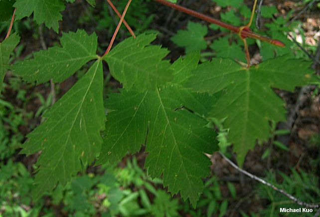 by Michael Kuo Habitat: Usually in moist areas, from mountain streams and canyons to lowlands. Stature: 10-30 feet high; under 1 foot in diameter; with a narrow crown. Leaves: 3-5 inches long; simple, with 3-5 lobes--but occasionally compound or nearly so, with 3 leaflets (both forms illustrated); prominently toothed; smooth; dark green above; light green below. Bark: Reddish brown; smooth. Fruit: A reddish "helicopter" under 1 inch long. |