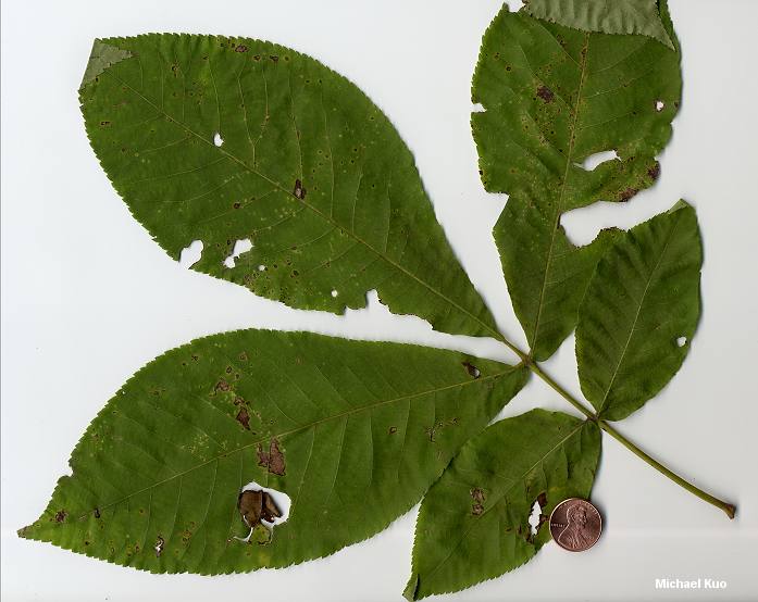 by Michael Kuo Habitat: Varied; in the north typically on high ground with oaks, but also in river bottoms; in the south typically in river bottoms and deltas; growing east of the Great Plains. Stature: 60-80 feet high; to 2 feet in diameter; with an open crown; branches large. Leaves: Compound; composed of 5 leaflets (occasionally 7), with 3 large (5-7 inches) leaflets at the end and 2 smaller ones below; leaflets candle-flame-shaped but often wider above the middle, finely toothed; dark green and smooth on top, yellow green below. Bark: Gray; conspicuously breaking up into long, loose plates that pull away from the tree. Nuts: 1-2.5 inches long; nut shell quite thick (1/4 to 1/2 inches); nut 4-sided, sweet. Frequent Mushroom Associates: Amanita species; Auricularia auricula; Cantharellus appalachiensis; Cortinarius distans; Lactarius zonarius; Russula uncialis; and others. |