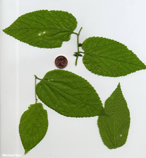 by Michael Kuo Habitat: Adapted to various ecosystems, from oak-hickory forests to southern hardwood and riverine ecosystems. Stature: To 100 feet high and 2 feet in diameter; with a spreading, rounded crown. Leaves: Candle-flame-shaped; toothed; green above; slightly paler below; asymmetrical at the base, with the base of the short side curving gracefully to meet the base of the long side; 2.5-4 inches long; with 3 main veins originating near the base. Bark: Brown to gray; smooth at first but soon distinctively warted, with the warts usually becoming arranged in longitudinal ridges as the tree matures. Fruit: A dark purple berry about 1/3 inch in diameter. Frequent Mushroom Associates: Perenniporia robiniophila and other hardwood decomposers. |