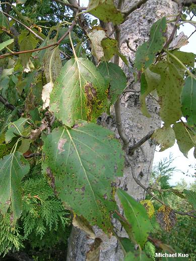 by Michael Kuo Note: This tree's distinctive, sweetly fragrant odor makes it identifiable with eyes closed. Habitat: Along streams in the Rocky Mountains; in bogs and recolonization areas in northern forests. Stature: Up to 80 feet high; to 3 feet in diameter; with a narrow crown. Leaves: Up to 6 inches long; broadly egg-shaped, with a pointed tip; finely toothed; dark green above; pale green to whitish below. Bark: Smooth and brown at first; soon becoming furrowed, and by maturity dark gray and deeply furrowed. Flowers: On catkins in spring; fruits tiny, attached to cottony hairs. Frequent Mushroom Associates: Hemipholiota populnea, Morchella esculentoides, Tricholoma populinum, and others. |