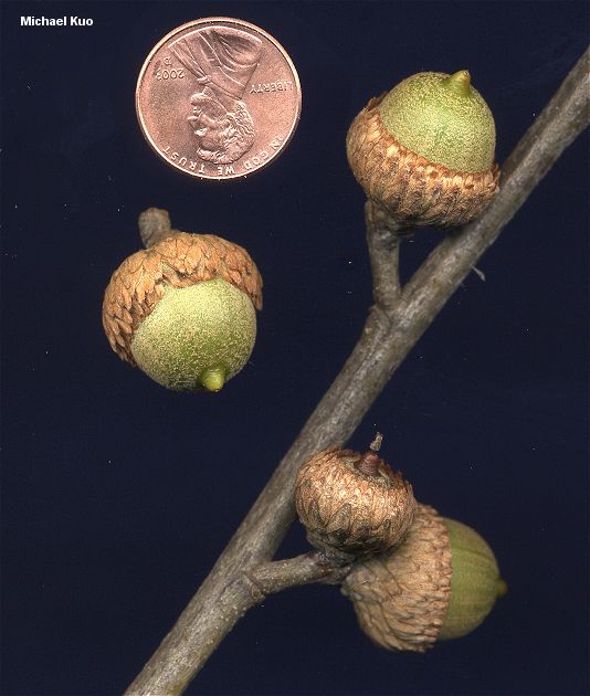 by Michael Kuo Note: The red oaks of eastern North America are often difficult to identify with certainty--and the task is complicated by the fact that many of the species hybridize. Habitat: Typically on dry or sandy soil; growing primarily east of the Mississippi River. Stature: 50-80 feet high; to 3 feet in diameter; with an open, rounded crown. Leaves: 3-7 inches long; with 5-9 bristle-tipped lobes; sinuses wide and C-shaped, extending more than halfway to the midrib; shiny and dark green above; shiny and paler green below, with small tufts of rusty hairs in the corners between veins. Bark: Thin; dark gray to nearly black; furrowed and ridged in age. Acorns: Bitter; to 1 inch long; enclosed for about 1/3 to 1/2 in a scaly cup; kernels white. |