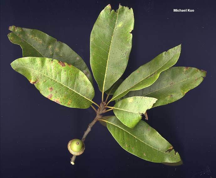 by Michael Kuo Habitat: Typically on moist soil; often growing with other oaks, hickories, or other hardwoods; growing east of the Great Plains. Stature: 50-60 feet high; to 3 feet in diameter; with a rounded crown. Leaves: 4-6 inches long; elliptical; thick; dark green and shiny on top, paler and minutely velvety below; with many yellow veins. Bark: Grayish brown; smooth, becoming shallowly furrowed in age. Acorns: Bitter; to 3/4 inch long; enclosed for about 1/3 to 1/2 in a scaly cup. |