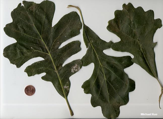 by Michael Kuo Habitat: Able to grow in dry or moist soil; east of the Great Plains. Stature: 60-80 feet high (or larger); to 3 feet in diameter; branches large and heavy; with an open, rounded crown. Leaves: 6-10 inches long; with 5-9 rounded lobes; typically with two central indentations that extend nearly to the midrib; dark green and shiny above; pale green and slightly hairy below. Bark: Gray to brown; thick; furrowed and ridged in age. Acorns: Sweet; to 2 inches long; enclosed 1/2 or more in a characteristically shaggy and hairy cup. |