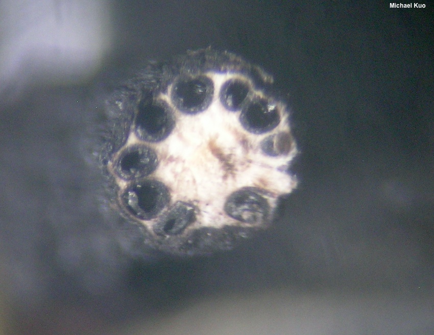 The Genus Xylaria [ Ascomycota > Sordariomycetes > Xylariales > Xylariaceae . . . ] by Michael Kuo The genus Xylaria consists of funky, club-like decomposers of wood or plant debris that become black and hard by maturity, reminiscent of carbon or charcoal. The mushrooms are "Pyrenomycetes," which means they produce spores in asci that are embedded in tiny pockets called perithecia; the asci take turns growing into the narrow opening of the pocket so that they can shoot spores away from the fungus and into the air currents. The Xylaria life cycle gets a little complicated, and the complications can make precise identification of one's Xylaria collections difficult. Like many fungi, Xylaria species hedge their reproductive bets by engaging in both sexual and asexual reproduction. The spores, asci, and perithecia mentioned above occur when the fungus is mature, and reproducing sexually. In its immature, asexual stage, a Xylaria produces asexual spores, officially called "conidia," in a powdery coating (morel hunters frequently encounter the conidial stage of Xylaria polymorpha in late spring). This is all well and good for the Xylaria, but more than a little problematic for would-be Xylaria identifiers, since the various species are usually separated on the basis of the morphology of their (sexual) spores. Thus, if you have collected a Xylaria in its asexual, conidial stage, you will be missing the most important morphological character for identification (the conidia, in case you're wondering why they can't substitute for spores in the identification process, tend to look more or less the same)—that is, unless you have a mycological laboratory and the ability to culture your collection; the species can actually be identified on the basis of the way the cultures look and act in the petri dish (see Callan & Rogers, 1993). Most of us, however, lack the ability to culture our collections, which means we can only accurately identify mature, sexual forms. In the field, these can often be recognized by the presence of perithecia, which look like tiny pimples (use a hand lens). Collectors in north-temperate regions can also employ the strategy of not collecting Xylaria specimens in spring and early summer, when asexual forms are more prominent. Even with identifiable specimens in hand, there is no getting around the fact that microscopic analysis is frequently necessary for accurate Xylaria identification—which leads many collectors to label their collections of fat specimens "Xylaria polymorpha" and their skinny collections "Xylaria hypoxylon," since these are species frequently included in field guides. This is not an unreasonable strategy if your identification goals are casual, but if you have a penchant for accuracy you will need to consult pyrenomycete expert J. D. Rogers's key to Xylaria in the continental United States (1986; full citation below). Xylaria species are not particularly easy to work with, microscope-wise, since they are very tough and not easily softened up for sectioning and slide preparation. Fortunately, since spore morphology is pretty much the only thing you're interested in (from an identification standpoint, anyway), you will not need to worry about keeping other microscopic structures intact. I slice a small sliver from the surface of a Xylaria, making sure that I have sliced just deeply enough to sever some perithecia (illustration), which are embedded between the surface and the tough, white flesh. Then I soak it in 90% alcohol as I would any section, before soaking it in water—for much longer than usual. When it has softened up as much as I think it is going to, I put in on the slide and begin slicing the &@%$ out of it with the razor blade, again and again, until I have very tiny, mountable fragments that are not so thick and hard that they lead to a cracked coverslip when I crush the mount. Xylaria spore morphology, including the thin, pale "germ slits" that can be crucial to identification, is best revealed in water mounts. Species Pages: Xylaria cornu-damae |