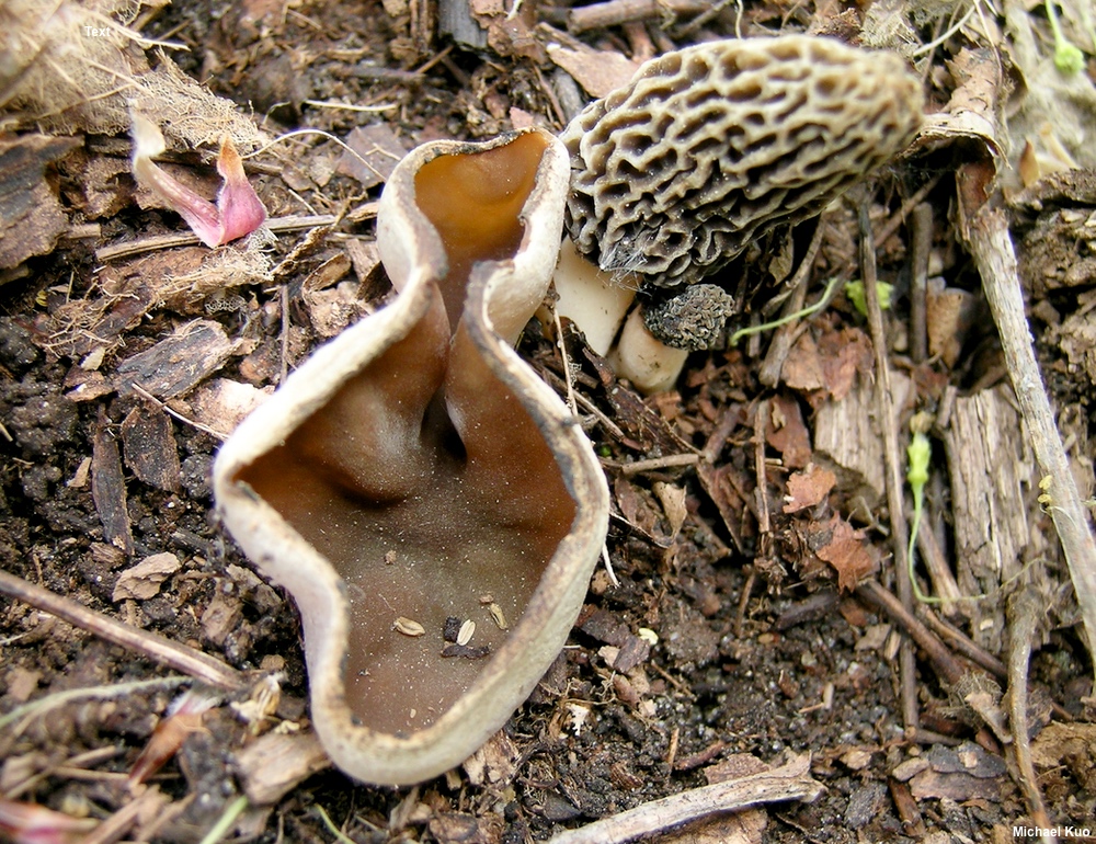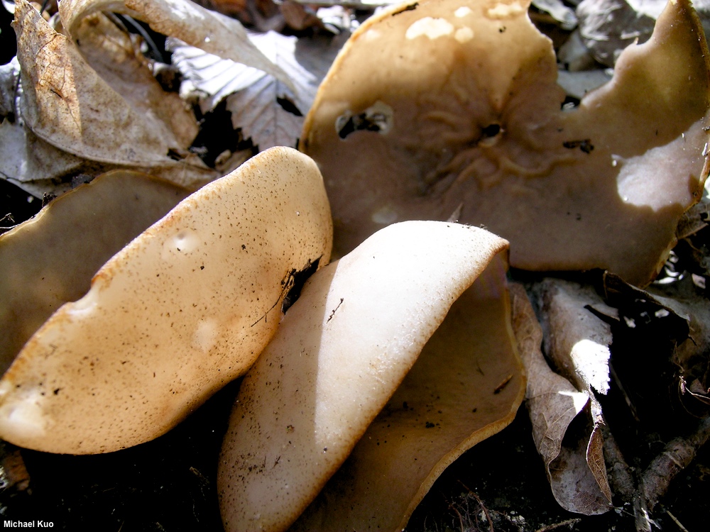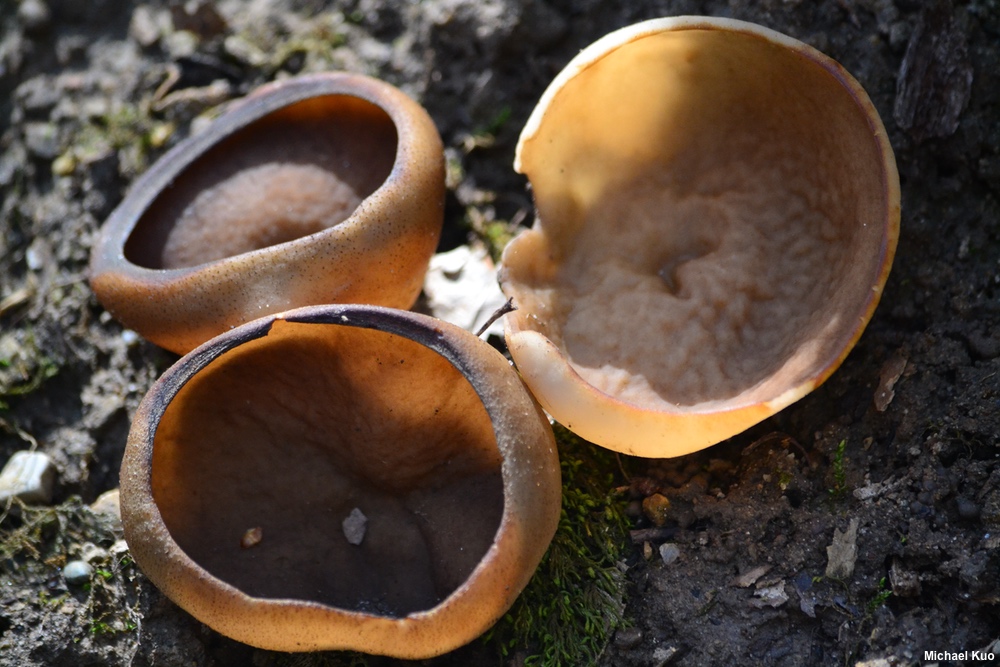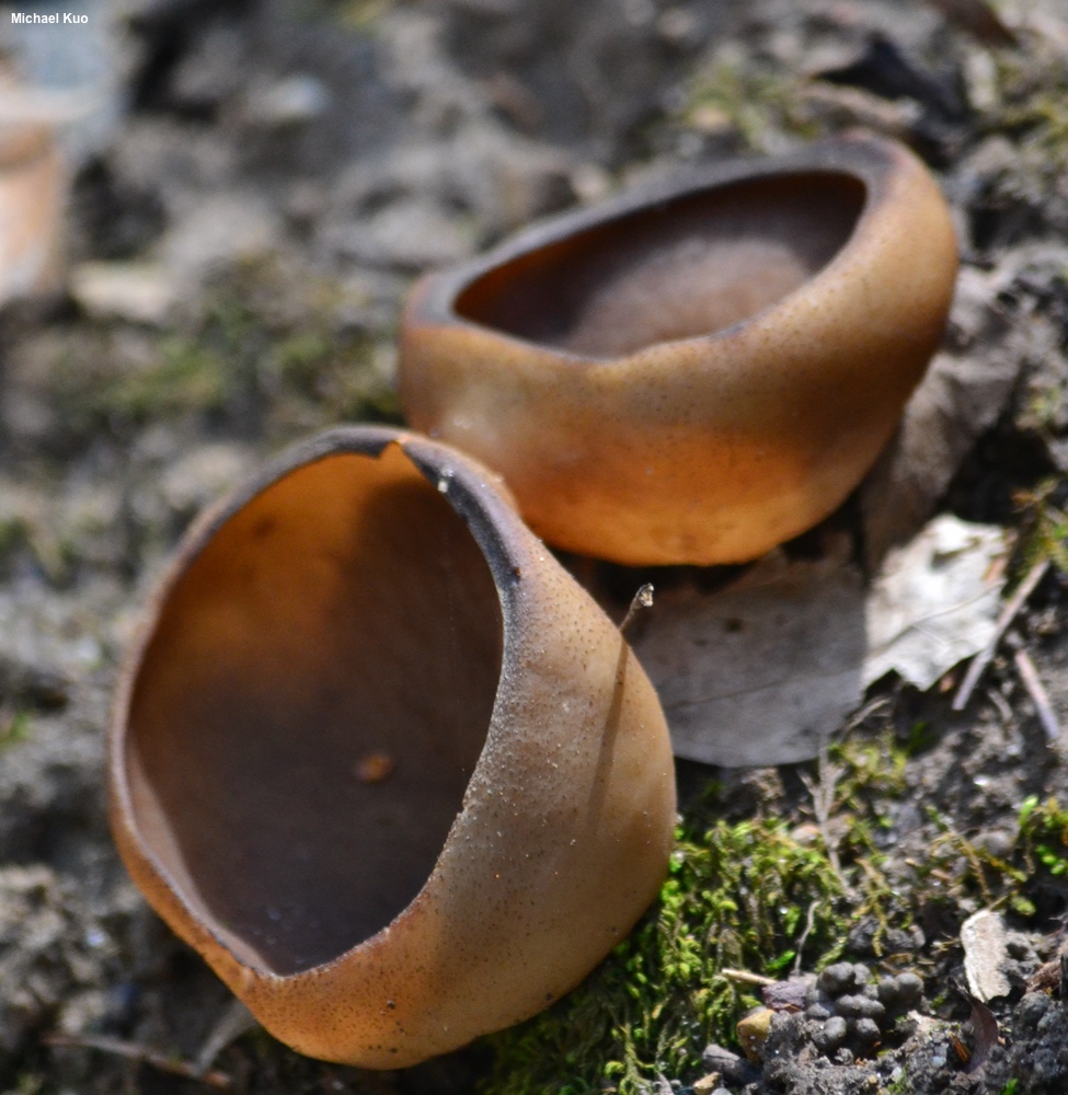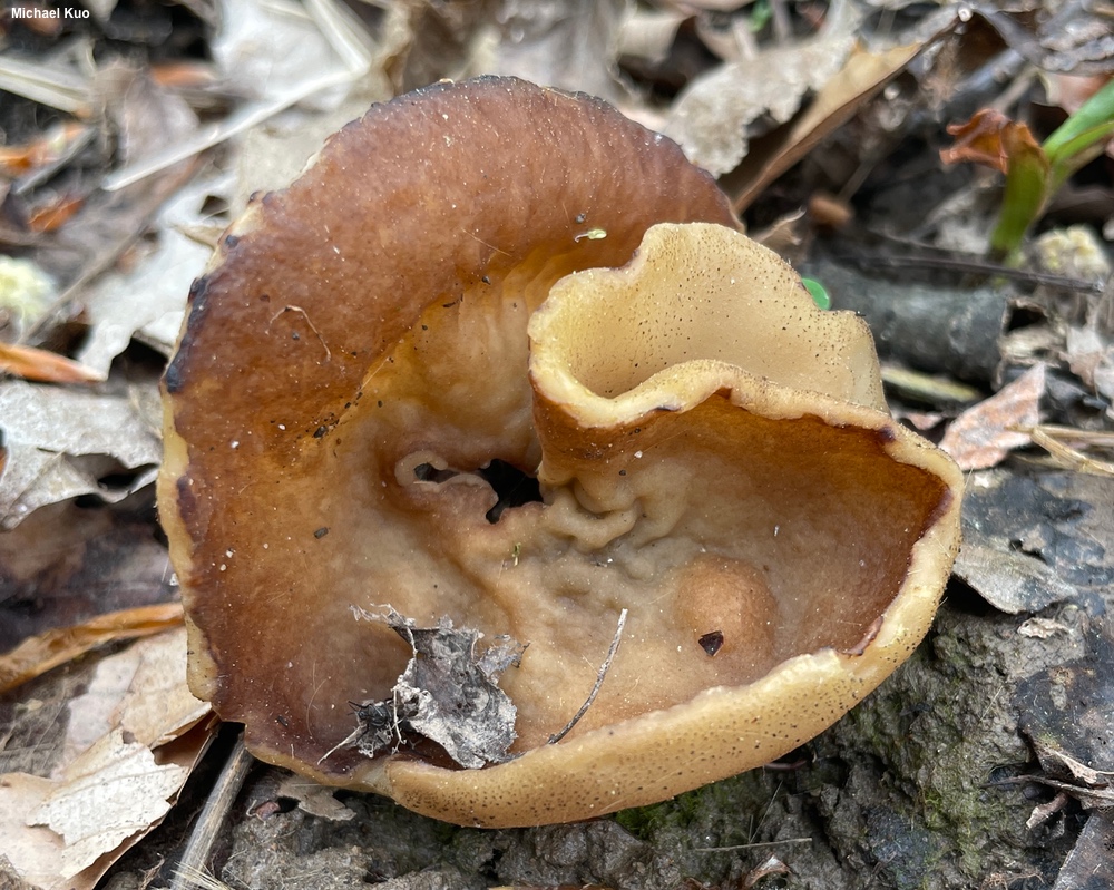 [ Ascomycota > Pezizales > Morchellaceae > Morchella . . . ] Disciotis venosa by Michael Kuo, 26 April 2025 Believe it or not, this cup fungus is a close relative of the Under the microscope Disciotis venosa looks quite a bit like a morel: it features large, ellipsoid spores with homogeneous contents, and paraphyses with brownish contents. Contemporary, DNA-informed study of Disciotis collections has not yet been published, so it remains uncertain whether European and North American versions of Disciotis venosa actually represent the same phylogenetic species—or whether there are multiple species involved. Description: Ecology: Uncertain; possibly saprobic and/or at least facultatively mycorrhizal; found primarily under hardwoods; growing alone, scattered, or gregariously; spring (usually during morel season); originally described from Austria (Persoon 1801); widely distributed in Europe and North America, though less common or absent in the southern areas of both continents; also documented from India. The illustrated and described collections are from Illinois, Michigan, and Ohio. Fruiting Body: 2–10 cm across; shaped more or less like a cup when young, often with a curled-in edge; in age flattening and becoming irregularly saucer-shaped. Upper Surface: Yellowish brown to brown or grayish brown; bald; often becoming pocked, wrinkled, or veined, especially over the center; the margin sometimes darkening to dark brown or even black. Excipular Surface: Whitish to pale tan, often dotted with tiny brown fibrils or scales—or appearing bald to the naked eye. Stem: Absent, but the cup is pinched together in the center where it meets the ground. Flesh: Brittle and pale brownish to whitish. Chemical Reactions: Ammonia, KOH, and iron salts all negative on upper surface and excipular surface. Odor and Taste: Not distinctive. European collections are often reported as having a bleachlike odor, but none of my North American collections has had any distinctive odor at all. Microscopic Features: Spores 19–25 x 10–15 µm; ellipsoid; smooth; with homogeneous contents; hyaline in KOH. Asci 8-spored. Paraphyses 5–12 µm wide at apex; cylindric with rounded, subclavate, clavate, or subcapitate apices; septate; hyaline or with brownish to brown contents in KOH. REFERENCES: (C. H. Persoon, 1801) L. Arnould, 1893. (Batra & Batra, 1963; Smith, Smith & Weber, 1981; Breitenbach & Kränzlin, 1984; Arora, 1986; Phillips, 1991/2005; Lincoff, 1992; Weber, 1995; O'Donnell et al., 1997; Roody, 2003; Kuo, 2005; O'Donnell et al., 2011; Buczacki et al., 2012; Beug et al., 2014; Kuo & Methven, 2014; Carris et al., 2015; Baroni, 2017; Gminder & Böhning, 2017; Læssøe & Petersen, 2019; McKnight et al., 2012.) Herb. Kuo 05299507, 04170501, 05090601, 05090603, 04270801, 05061302, 04192501. Herb. ILLS 00105085 (ASM 13701). This site contains no information about the edibility or toxicity of mushrooms. |
