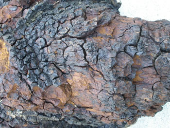 Description: Resembling charred wood or a canker-like