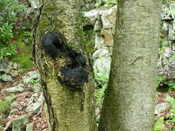 Inonotus obliquus on yellow birch (Betula