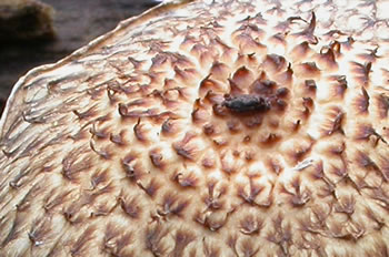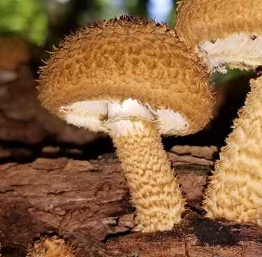 Veil: Coarse, rusty brown fibrils flare upward and form