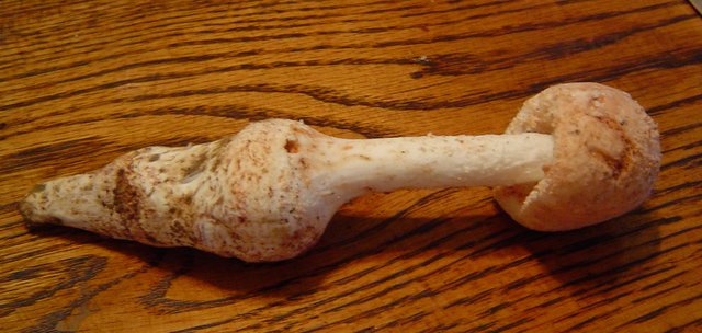 The largest portion of this mushroom's basal bulb develops above ground. This specimen was 10 inches tall, cap 5.5 inches wide. Big mushroom! |