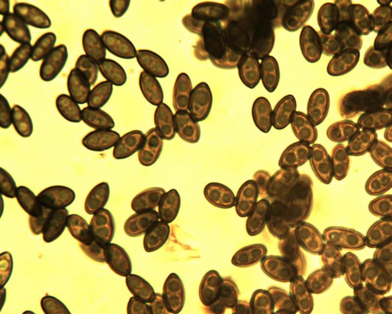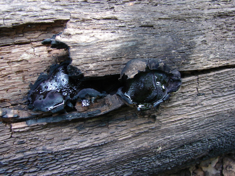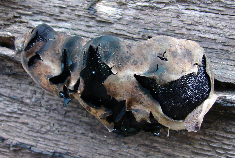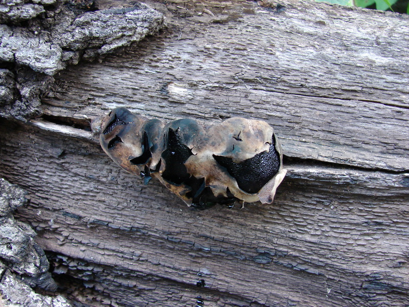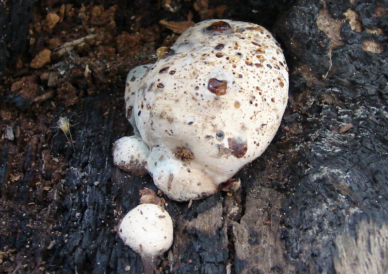Camarops petersii at various stages of development. This sac fungus is also known as Peridoxylon petersii. Growing from burnt hardwood log at the Indiana Dunes National Lakeshore in Porter County, Indiana; August. Note white outer layer and brown liquid exhibited at early stage of development (top left picture; 4cm wide). |