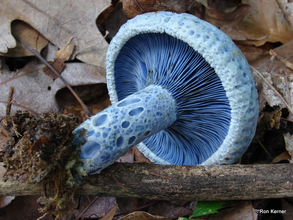Blue cap, blue stem, blue gills, bruises blue and the milk is blue. Cream colored spore print. Concentric zones often, but not always, present on cap. Bruising and milk will slowly turn from blue to greenish. Commonly found during summer and fall in hardwood and conifer woods. |