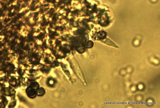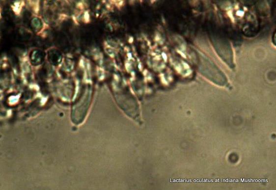 The cystidia of Lactarius oculatus have tapered, pointed and constricted ends. |