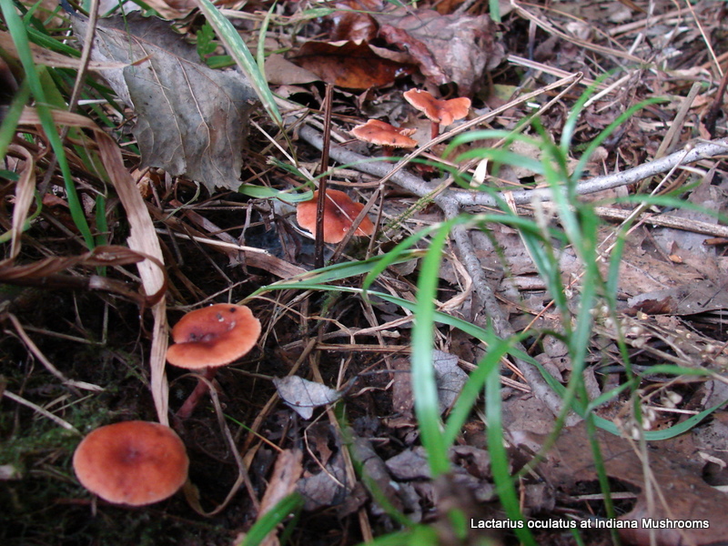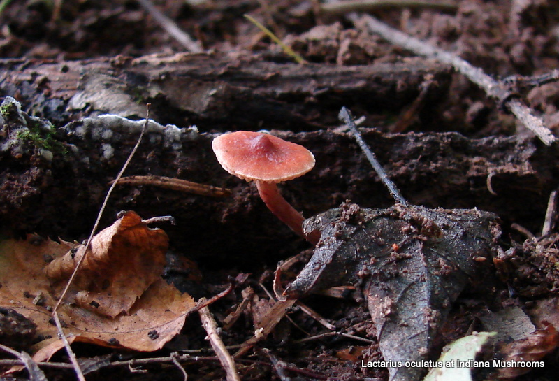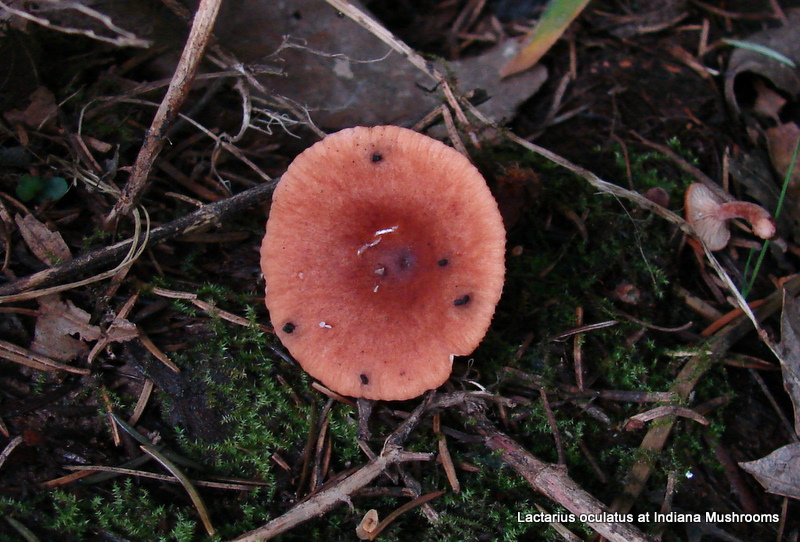 The Eye Spot Milky. Found late summer, early fall. This milk cap mushroom has several features that are not always apparent: the lined cap margin, zonate cap when young and absence of papilla (nipple) when cap becomes depressed, or sunken. |