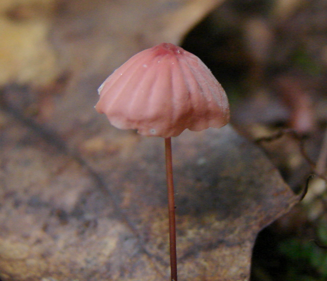 Growing from leaf litter. The cap of this tiny mushroom is less than