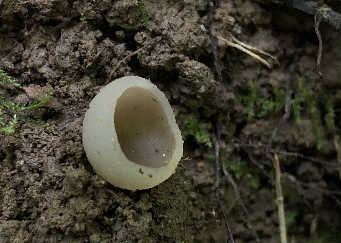 Formerly Peziza succosa. Growing from moss covered soil that included woody debris. Oak and pine in the area. This collection exhibited an inner cup with gray/brown to tanish color tones, at times faint purple tints; smooth. Outer cup is off-white, slightly roughened; staining and ageing a yellow to rusty red. Very small stem at point of attachment, often with white mycelium. |