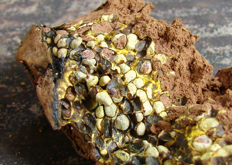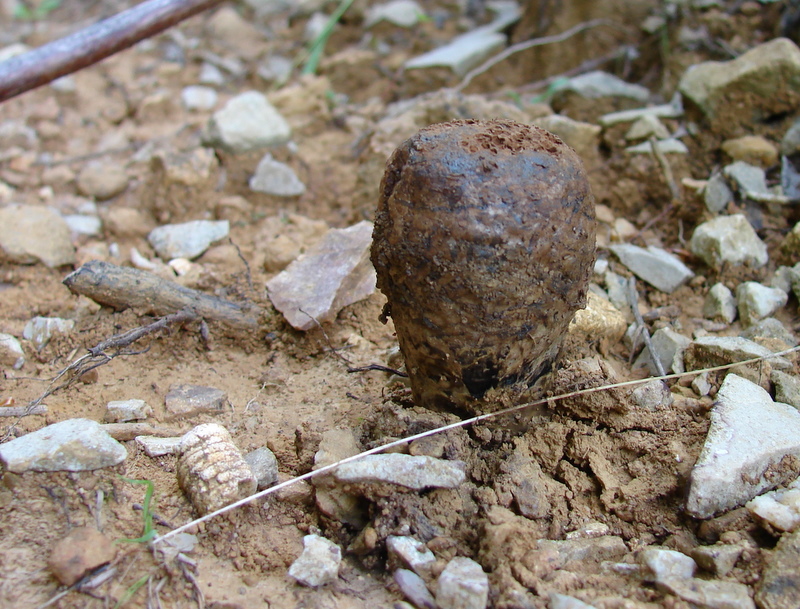 Found mid-August. Pine and oak trees present. Sand and gravel soil; Morgan- Monroe State forest. This interesting fungus produces tiny spore sacks (peridioles) within the fruit body. These spores sacks disintegrate as the fungus matures and spores are released as the fruit body also disintegrates. Note fibrous rhizomorph (root-like structure). Other names misapplied to this fungus are Pisolithus tinctorius, an illegitimate name and Pisolithus arhizus, a European species. |