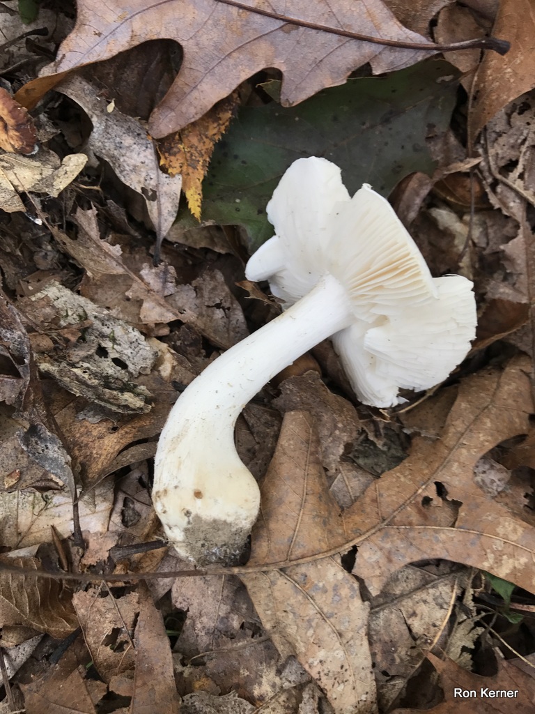 Came upon this raggedy all white, nondescript mushroom at the end of a hike and almost passed it by. But the faint bluing at the center of the cap caught my eye and I snapped a couple pics and collected the single specimen. Oak/beech woods; fall. White spore print. Large stature. Blue and brown coloration at center of cap. Gills attached by a notch. Swollen base. |