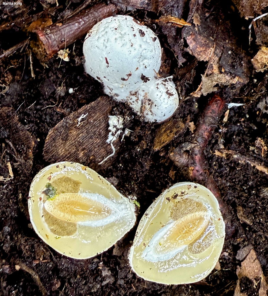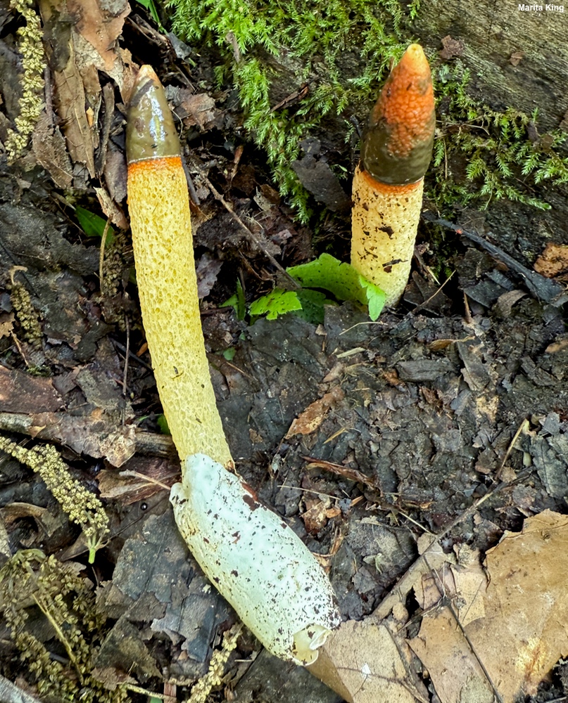 Mutinus caninus [ Basidiomycota > Phallales > Phallaceae > Mutinus . . . ] by Michael Kuo, 26 August 2025 This distinctive stinkhorn features orange colors, and a small "head" that is not structurally distinct from the stem, although it is often separated by a constriction, as though someone tied a string to emphasize the separation. Mutinus caninus is primarily a European fungus, but it does appear in North America, at least in Ohio (see discussion below). Four other North American and European stinkhorns should be compared with Mutinus caninus if you are trying to identify it. The easiest to separate is Phallus rugulosus, which features a structurally separate head that sits atop the stem, a bit like a floppy thimble on a pencil. Mutinus elegans is also fairly easily separated; its head area is proportionally larger and less clearly defined. The more difficult look-alike is Mutinus ravenelii, which has a small head area that is sometimes separated by a constriction. However, ravenelii is pink and red when fresh, while caninus is orange. Last but not least, Mutinus caninus albus is very similar, but white. Under the microscope, the spores of Mutinus caninus are substantially longer and more cylindric than the spores of the other look-alike species. An additional feature separating Mutinus caninus from the other Mutinus species in the list can be found in the surface of the stem, which has more or less the same texture between the "head" and "stem" portions for elegans, ravenelii, and albus—but is markedly different in caninus, with a bumpy texture for the "head" area and a pocked texture for the "stem" area. Mutinus caninus is not common in North America, and it may be limited to Ohio. I have just gone through all the online "Mutinus caninus" reports from North America at iNaturalist and Mushroom Observer, and none of them actually appears to match caninus; the reports are all easily attributable to elegans or ravenelii—or, often, Phallus rugulosus. As far as North American literature is concerned, the name "caninus" has often been used to represent elegans (e.g. McIlvaine 1900, Smith 1949), or to represent ravenelii (e.g. Smith 1951). For the last 75 years or so North American authors appear to have assumed the presence of caninus on our continent based on the previous, erroneous literature, without actually documenting its presence. No photograph of any North American Mutinus in my library actually matches caninus—with one exception: In 1907 C. G. Lloyd published black and white photos of Mutinus elegans, ravenelii, and caninus in North America, along with descriptions of these stinkhorns. Lloyd's species concepts agree with those I am presenting here and, of caninus, he writes: "This is the original species of Europe and appears to be very rare in the United States. I have received it but once . . . and have seen but one photograph of an American plant that I think should be so referred. I am pleased to present this photograph (Fig. 184) recently received from Professor M. E. Hard, Chillicothe Ohio." The collection described and illustrated below and to the right, made by Marita King, is also from Ohio, more than 100 years later. Are these the only North American reports that actually match the species? Please contact me at herbarium@mushroomexpert.com if you believe you have collected or photographed Mutinus caninus in North America! Thanks to Marita King for documenting, collecting, and preserving Mutinus caninus for study; her collection is deposited in The Herbarium of Michael Kuo Description: Ecology: Saprobic; growing alone or gregariously in gardens and cultivated areas, or in woods; summer and fall; originally described from Germany (Schaeffer 1774); widespread in Europe; reported, probably inaccurately, from South America, Africa, and Oceania; in North America documented in Ohio (here, and in Lloyd 1907). The illustrated and described collection is from Knox County, Ohio. Immature Fruiting Body: A whitish "egg" 2–4 cm high and 1.5–3 cm wide; surface smooth; when sliced revealing the pale orange stinkhorn-to-be, along with developing brownish spore slime, encased in a gelatinous substance. Mature Fruiting Body: 6–16 cm high; 1–2 cm thick at widest point; cylindric, with a conic apical "head" section that is clearly demarcated, sometimes with a belt-like constriction, at maturity accounting for well under one-fourth of the stinkhorn's total height. Head section when fresh covered with brown spore slime; surface underneath finely bumpy, bright orange. Stem section coarsely pocked and pitted; bright to pale orange, fading to nearly yellow; base encased in a white, sacklike volva up to 4.5 cm high; attached to thin white rhizomorphs. Odor: Foul while the spore slime is present. Microscopic Features: Spores 5–7 x 1–1.5 µm; cylindric; smooth; hyaline in KOH. Sphaerocysts of the pseudostipe 15–155 µm across; irregularly subglobose to ellipsoid; thin-walled; smooth or a little roughened; hyaline in KOH. Hyphae of the volva 2–8 µm wide; occasionally branching; smooth; septate; hyaline in KOH. Clamp connections not found. REFERENCES: (J. C. H. von Schaeffer, 1774) E. M. Fries, 1849. (Lloyd, 1907; Lloyd, 1909; Maas Geesteranus, 1971; Phillips, 1981; Breitenbach & Kr&aauml;nzlin, 1986; Schalkwijk-Barendsen, 1991; Tejera et al., 1998; Boccardo et al., 2008; Buczacki et al., 2012; da Silva et al., 2015; Gminder & Böhning, 2017; Kibby, 2017; Jeppson, 2018; Læssøe & Petersen, 2019; Melanda et al., 2021.) Herb. Kuo 06022501. This site contains no information about the edibility or toxicity of mushrooms. |
