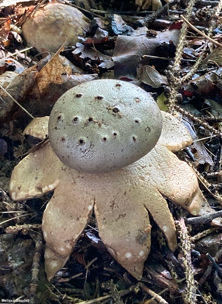[ Basidiomycota > Geastrales > Geastraceae > Myriostoma . . . ] Myriostoma coliforme by Michael Kuo, 9 September 2025 This infrequently encountered, interesting earthstar differs from species of Geastrum and Astraeus in developing multiple perforations across the surface of its spore case, rather than a single perforation at the top. Additionally, Myriostoma coliforme has a spore case that sits atop a series of small columns, best seen by turning the earthstar upside down and bending back the star's rays. Although it is a fairly rare fungus, it is apparently "locally common" in some European and North American areas. Thanks to Melissa Goodell for collecting, documenting, and preserving Myriostoma coliforme for study; her collection is deposited in The Herbarium of Michael Kuo. Description: Ecology: Saprobic; growing gregariously in sandy soil in open places, but often near trees; spring through fall, but dried-out specimens are sometimes encountered over winter, especially in warm climates; originally described from Great Britain (Dickson 1785); widely distributed in Europe and North America; also recorded from Hawaii (records from elsewhere probably represent other Myriostoma species). The illustrated and described collection is from Michigan. Fruiting Body: At first a round to egg-shaped ball, partially submerged in the substrate; with maturity the outer skin peeling back to form 6–12 pale brown, radiating, pointed arms stretching 6–12 cm across, composed of flesh 2–4 mm thick; undersides of arms darker brown and cracked-scaly; spore case 3–7 cm across, brownish to grayish, roughened or nearly smooth, developing 10– round perforations, sitting atop a series of pale brown basal columns; interior of spore case brown, soon powdery. Microscopic Features: Spores 4–8 µm including ornamentation of moderately dense spines 0.5–1.5 µm long, with bases 0.5 µm thick; globose; brownish yellow in KOH. Capillitial threads 2–5 µm wide; with occasional single, short, digitate projections; walls roughened or very finely spiny, 1 µm thick; brown-walled in KOH. REFERENCES: (J. J. Dickson) A. K. J. Corda, 1842. (Lloyd, 1901; Coker & Couch, 1928; Smith, 1951; Dring & Rayner, 1967; Ponce de Leon, 1968; Geesteranus, 1971; Phillips, 1981; Smith, Smith & Weber, 1981; Smith & Ponce de Leon, 1982; Arora, 1986; Lincoff, 1992; Kruger et al., 2001; Hemmes & Desjardin, 2002; Bates, 2004; Calonge et al., 2004; Hosaka et al., 2006; Miller & Miller, 2006; della Maggiora, 2010; Hemmes & Desjardin, 2011; Buczacki et al., 2012; Jeppson et al., 2013; Zamora et al., 2014; Cripps, Evenson & Kuo, 2016; Kibby, 2017; Sousa et al., 2017; Elliott & Stephenson, 2018; Sunhede, 2018; Læssøe & Petersen, 2019.) Herb. Kuo 08102501. This website contains no information about the edibility or toxicity of mushrooms. |