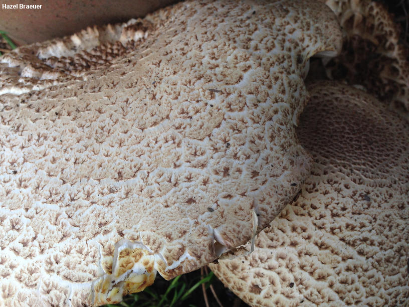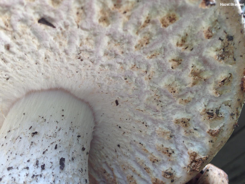 Agaricus augustus [ Basidiomycota > Agaricales > Agaricaceae > Agaricus . . . ] by Michael Kuo This stunning species, sometimes called "the Prince," is fairly common in California and the Pacific Northwest. It grows under conifers, but is not usually a woodland species; it seems to prefer conifers growing near roads, paths, gardens, parks, and so on. Agaricus augustus is fairly easily identified by its large size, its scaly brown cap, and its strong odor, which is sharp and reminiscent of almonds. A few similar species can be eliminated by adding the Prince's white-then-brown (never pink) gills to the list of distinguishing features, along with its scaly stem. Similar species can be found in other regions, including Agaricus julius in the Rocky Mountains, and Agaricus nanaugustus in the Midwest and eastern United States. Thanks to Hazel Braeuer for collecting, documenting, and preserving a collection of Agaricus augustus for study; her collection is deposited in The Herbarium of Michael Kuo. Description: Ecology: Saprobic; growing scattered or gregariously under conifers, usually along roadsides or paths, or in lawns and gardens; summer and fall, or in winter and spring in warmer climates; West Coast. The illustrated and described collection is from British Columbia. Cap: 10–35 cm; usually blocky and nearly cylindric at first, becoming convex to broadly convex or nearly flat; dry; whitish underneath a dense covering of brown to dark brown, fibrillose scales; bruising yellow, at least near the margin. Gills: Free from the stem; close or nearly crowded; white when young, becoming grayish brown and eventually dark chocolate brown to blackish (without a pink stage); covered when in the button stage with a whitish, cog-wheeled partial veil that features brownish scales. Stem: 10–20 cm long; up to 4 cm thick; more or less equal; often rooting; adorned with a large, skirtlike, whitish ring; whitish and fairly bald above the ring, but below the ring covered with whitish to faintly brownish scales. Flesh: White; unchanging when sliced. Odor and Taste: Odor strong, reminiscent of almonds; taste similar. Chemical Reactions: KOH yellow on cap surface. Spore Print: Dark chocolate brown. Microscopic Features: Spores: 8–10 x 4.5–6 µm; ellipsoid, with a fairly prominent apiculus; smooth; thick-walled; brown in KOH; brown in Melzer's reagent. Cheilocystidia up to about 30 x 10 µm; mostly subglobose to more or less cylindric. Pileipellis a cutis with bundles of uplifted brown, septate elements. REFERENCES: Fries, 1838. (Saccardo, 1887; Smith, 1975; Smith, Smith & Weber, 1979; Arora, 1986; Kerrigan, 1986; McKnight & McKnight, 1987; Phillips, 1991/2005; Lincoff, 1992; Nauta, 2001; Miller & Miller, 2006; Kuo, 2007; Knudsen, Lange & Knutsson, 2008; Trudell & Ammirati, 2009; Desjardin, Wood & Stevens, 2015; Siegel & Schwarz, 2016.) Herb. Kuo 06281405. This site contains no information about the edibility or toxicity of mushrooms. |