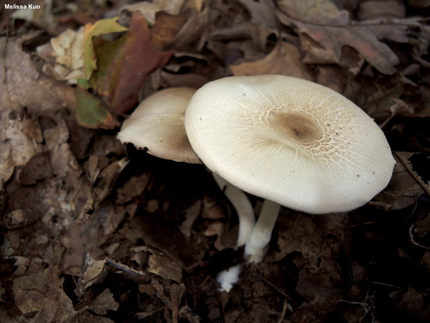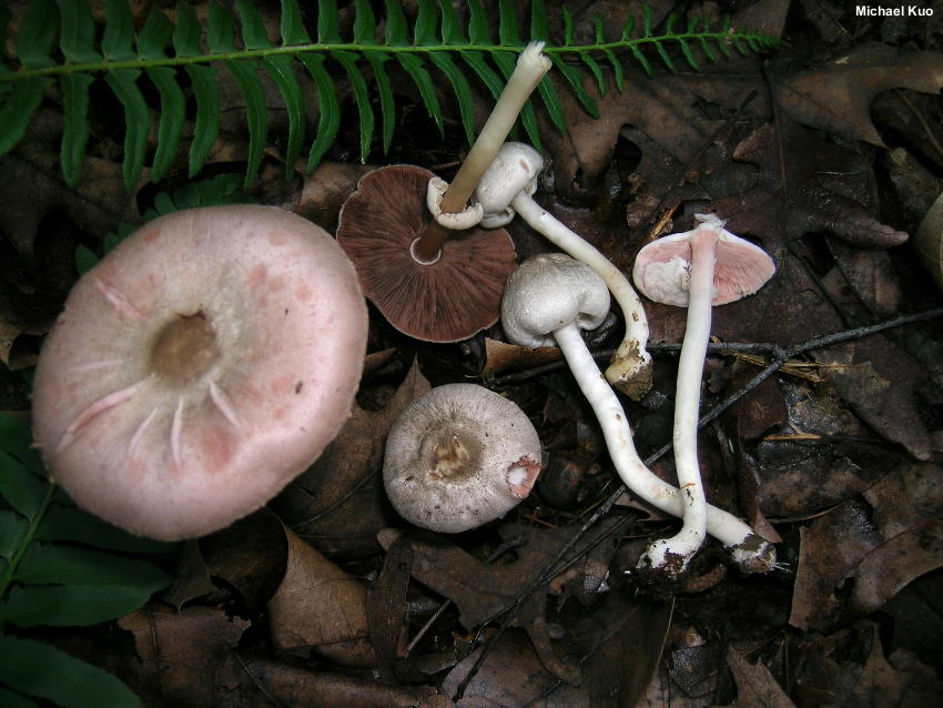 Agaricus leptocaulis [ Basidiomycota > Agaricales > Agaricaceae > Agaricus . . . ] by Michael Kuo This woodland, eastern North American species of Agaricus was given a name in 2016 by Agaricus expert Rick Kerrigan, who used the epithet leptocaulis to emphasize the thin stem of the species. It is similar to Agaricus pocillator and Agaricus placomyces—but the former species features a cup-like bulb at the base of the stem and the latter species has a thicker stem. Like most species in the Xanthodermatei section of Agaricus, Agaricus leptocaulis stains yellow and features yellow flesh in the base of the stem. There are apparently two versions of Agaricus leptocaulis: a primarily white, southeastern United States version, and a brown-centered Midwestern version. Kerrigan (2016) noted that the Ohio collection he had studied had "a darker disc and slightly smaller spores" than North Carolina collections; the Illinois and Indiana collections featured here match the Ohio collection (which can be seen at mushroomobserver.org, observation 24015) and lend support to the idea that the brown-centered version of the species may be more northern than the white version. Until Kerrigan's publication I treated Agaricus leptocaulis as "Agaricus placomyces," both here and in Mushrooms of the Midwest (2014). Phillips (1991/2005) apparently does the same in Mushrooms and Other Fungi of North America. Description: Ecology: Saprobic; growing alone or gregariously under hardwoods and conifers in forests; summer and fall; southeastern United States, north to the southern Appalachians. The illustrated and described collection is from Georgia. Cap: 3–9 cm; convex at first, becoming broadly convex or flat in age; dry; creamy white with a dark brown center; often becoming finely fibrillose; in wet weather sometimes developing pink shades. Gills: Free from the stem; crowded; short-gills frequent; white, becoming pink, then brown; when young covered by a rubbery, whitish partial veil. Stem: 7–13 cm long; 0.5–1 cm thick; more or less equal above a bulbous base; bulb usually small and abrupt; whitish, bruising yellow; sometimes pinkish toward the apex; with a thick whitish ring; basal mycelium white and often prominent. Flesh: White throughout; staining bright yellow in the base. Odor and Taste: Odor phenolic or not distinctive. Chemical Reactions: KOH yellow on cap surface. Spore Print: Brown. Microscopic Features: Spores 5–6 x 3–4 µm; more or less ellipsoid; smooth; thick-walled; brown in KOH. Basidia 4-sterigmate. Cheilocystidia 20–25 x 6–10 µm; clavate to subglobose; septate; smooth; thin-walled; hyaline to brownish in KOH. Pileipellis a cutis; elements 2.5–7.5 µ wide, smooth, golden brown in KOH. REFERENCES: Kerrigan, 2016. (Phillips, 1991/2005 ["pocillator"]; Kuo & Methven, 2014 ["pocillator"].) Herb. Kuo 06099601, 09020102, 07140309, 06290701, 10211701. This site contains no information about the edibility or toxicity of mushrooms. |