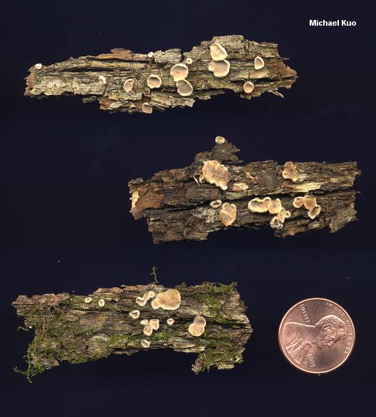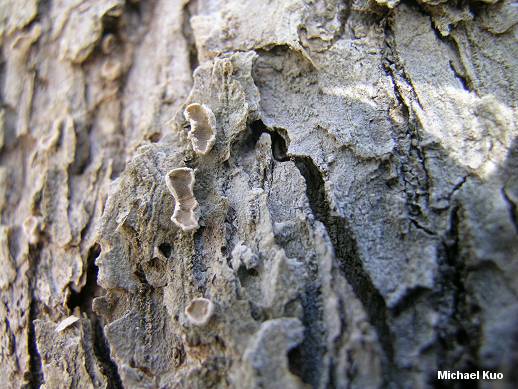 Aleurodiscus oakesii [ Basidiomycetes > Russulales > Stereaceae > Aleurodiscus . . . ] by Michael Kuo If your vision is as bad as mine, it's easier to see Aleurodiscus oakesii, which measures only a few millimeters across, from 20 feet away; it creates smooth patches in the bark of hardwood trees--especially the bark of oaks. In fact, when I wrote this site's page for white oak three years ago, I provided a description and illustration of such a smooth patch, not knowing that the cause was a mushroom! Up close and personal, Aleurodiscus oakesii requires removing one's glasses (for me, anyway) and pressing one's forehead against the tree to inspect the patches of smooth bark. The tiny, saucer-shaped mushrooms are pale brown, and often appear near the borders of the smooth patches. They are so tiny that there is almost nothing to describe--unless you use a microscope to see the many fascinating and beautiful microscopic features (see the description below). While Aleurodiscus oakesii is a parasite, it sticks to the outer bark of the trees it infests, and does not seriously threaten the health of its hosts. Description: Ecology: Parasitic; growing alone or, more commonly, gregariously on the outer bark of hardwoods--especially oaks, elms, and hop hornbeam; appearing year-round, when weather is warm; widely distributed in eastern North America. Fruiting Body: Only a few millimeters across (to about 5 mm maximum); saucer-shaped or irregular; broadly but centrally attached to the bark; leathery; upper surface pale brown and fairly smooth; under surface whitish and minutely fuzzy; the margin often folded slightly upwards to expose the under surface; without a stem. Microscopic Features: Spores 17-25 x 12-14 µ; elliptical or egg-shaped; roughened at maturity; amyloid. Acanthohyphidia present, developing prominent and numerous spines. Pseudocystidia present. REFERENCES: (Berkeley & Curtis, 1873) Patouillard, 1875. (Saccardo, 1888; Lemke, 1964; Chamuris, 1988; Lincoff, 1992; McNeil, 2006.) Herb. Kuo 10270405, 04130601. This site contains no information about the edibility or toxicity of mushrooms. |