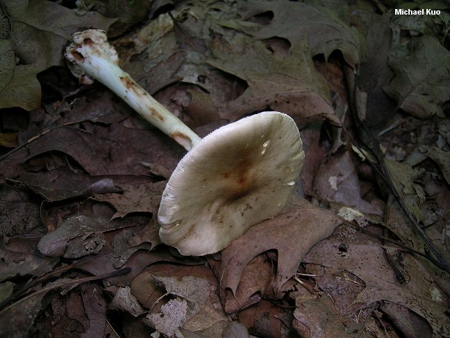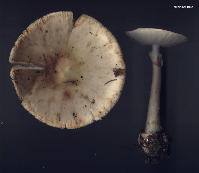 Amanita brunnescens [ Basidiomycetes > Agaricales > Amanitaceae > Amanita . . . ] by Michael Kuo Sometimes called the "cleft-foot Amanita," this eastern North American species features a variable, brown to whitish cap. The distinguishing feature of this relatively easily recognized mushroom is its stem, which, when acting the way it's supposed to, ends in an abrupt basal bulb that is split or "chiseled" in one or more places, and discolors reddish brown. Unfortunately for would-be Amanita identifiers, however, Amanita brunnescens hasn't read much Amanita literature and does not always manifest a perfectly bulbous, chiseled stem base; collections with wimpy, non-chiseled bases can be difficult to identify. Amanita brunnescens var. pallida, recognized by some authors, is virtually identical, but has a nearly white cap. I have collected it growing alongside the typical, brown variety, and I have seen specimens that seemed to "intergrade" between the colors of the putative varieties; for this reason I am treating var. pallida as a synonym of the type variety. Description: Ecology: Mycorrhizal with various hardwoods and conifers; growing alone, scattered, or gregariously; summer and fall; widely distributed and common east of the Rocky Mountains. Cap: 3-11 cm, convex, becoming broadly convex with a shallow central bump, or nearly flat; tacky at first or when wet; varying in color from grayish brown to whitish, often with a darker center; sometimes developing reddish brown stains; often somewhat streaked or mottled in appearance; usually featuring a few scattered, randomly distributed white to grayish or tan warts; the margin often becoming faintly lined for a few mm. Gills: Free from the stem; white; close or crowded; not discoloring, or sometimes discoloring brownish. Stem: 6-12 cm long; 0.5-1.5 cm thick above the bulb; tapering to apex; bald or silky; with a relatively persistent, skirtlike, white ring that sometimes develops a reddish brown edge and often collapses against the stem; usually ending in an abrupt, rimmed basal bulb that is "chiseled" or split vertically in one or more places; discoloring and bruising reddish brown, especially near the base; volval remnants usually absent but occasionally present as a few patches along the upper rim of the bulb. Flesh: White throughout; firm; not discoloring, or sometimes discoloring or bruising reddish brown, especially around worm channels. Odor: Not distinctive. Chemical Reactions: KOH on cap surface negative; on flesh in stem base slowly slightly yellowish. Spore Print: White. Microscopic Features: Spores 6.5-10 µ; smooth; globose or subglobose; amyloid. Basidia without basal clamps; 4-spored. Pileipellis a cutis or ixocutis of hyphae 2-6 µ wide. Lamellar trama bilateral; subhymenium ramose or with inflated cells. REFERENCES: Atkinson, 1918. (Smith, 1949; Smith, Smith & Weber, 1979; Arora, 1986; Jenkins, 1986; Phillips, 1991/2005; Lincoff, 1992; Metzler & Metzler, 1992; Barron, 1999; Roody, 2003; McNeil, 2006; Miller & Miller, 2006; Binion et al., 2008; Tulloss, cont. upd.) Herb. Kuo 06229501, 07200203, 07200204, 07200205, 06120301, 07160703, 07100802, 10170904, 06221010. This site contains no information about the edibility or toxicity of mushrooms. |