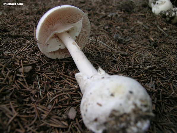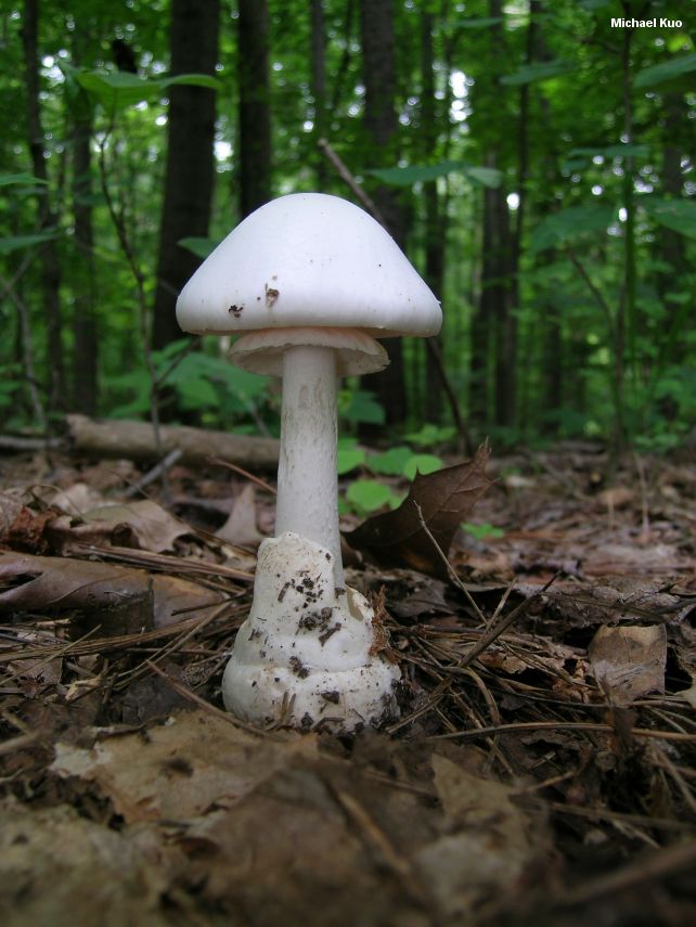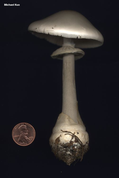 Description: Ecology: Mycorrhizal with various hosts--I have collected it under loblolly pine and under Norway spruce; Rod Tulloss (cont. upd.) documents it under various hardwoods and conifers; growing alone or scattered; summer and fall; apparently distributed around the Great Lakes and in the northeast. Cap: 4-10 cm; convex, becoming broadly convex, broadly bell-shaped, or nearly flat in age; bald or, when young, with scattered volval patches; dry or sticky; white to ivory; the margin not lined. Gills: Free, or nearly free, from the stem; close or crowded; with frequent short-gills; white. Stem: 6-12 cm long; 1-2 cm thick; tapering to apex; with an enlarged, bulbous base that measures up to 4 cm in diameter and features a tapering, rooted underside; somewhat shaggy or nearly bald; white; with a persistent, notably thickened, felty, high, skirtlike ring that may feature a grooved upper surface; with a white, sacklike volva encasing the base. Flesh: White throughout. Odor: Reminiscent of raw potatoes, or not distinctive. Spore Print: White. Chemical Reactions: KOH negative on cap surface. Microscopic Features: Spores 8-11 x 5.5-8 µ; smooth; ellipsoid; amyloid. Basidia without clamps; 4-spored. Pileipellis a cutis or ixocutis. Lamellar trama bilateral. REFERENCES: Peck, 1897. (Saccardo, 1899; Tulloss, cont. upd.) Herb. Kuo 08250604, 07300904. This site contains no information about the edibility or toxicity of mushrooms. |