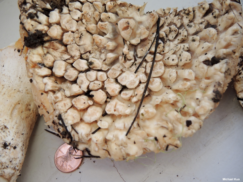 Amanita magniverrucata [ Basidiomycota > Agaricales > Amanitaceae > Amanita . . . ] by Michael Kuo White Amanita species in section Lepidella are notoriously difficult to separate, but Amanita magniverrucata is fairly easily recognized by its huge pyramid-shaped warts, its slightly rooting stem base, and its range (from northern California to Baja California). Amanita cokeri is similar, but its warts are much smaller, and its stem base features prominent, peeled-back scales—and it appears thousands of miles away, in eastern North America. Thanks to University of California Herbarium for facilitating my study of the collection cited below. Description: Ecology: Mycorrhizal; originally recorded under Bishop pine, but since reported under other conifers and, according to Jenkins (1986) and Tulloss (2013), under coast live oak; winter; originally described from California; distributed from northern California to Baja California. The illustrated and described collections are from California. Cap: 5–15 cm; convex, expanding to planoconvex; when young with an inrolled margin; covered over the center with very large, pyramid-shaped warts, and towards the margin with smaller warts; whitish, sometimes bruising and discoloring slightly brownish; the margin often appendiculate with hanging veil material. Gills Free from the stem; close; whitish, becoming a little brownish with old age; with frequent short-gills. Stem: 5–18 cm long; 2–4 cm thick; equal or tapering slightly to apex; whitish; sometimes bruising and discoloring brownish to reddish brown; bald or finely hairy; with a large, white, delicate ring that is often lost by maturity; with a swollen base that usually has a root-like extension; with whitish veil material at the base, usually appearing as concentric zones of soft scales at the top of the bulb and the lower part of the stem. Flesh: White; unchanging when sliced. Odor: Unpleasant and strong, reminiscent of spoiled meat. Spore Print: White. Microscopic Features: Spores 10–12 x 6–8 µm; ellipsoid, with a tiny apiculus; smooth; hyaline in KOH; amyloid. Basidia 32–35 x 10–12 µm; clavate; 4-sterigmate. Hymenial cystidia not found. Pileipellis not differentiated. REFERENCES: H. D. Thiers & J. Ammirati, 1982. (Thiers, 1982; Arora, 1986; Jenkins, 1986; Phillips, 1991/2005; Tulloss, 2009; Tulloss, 2013; Desjardin, Wood & Stevens, 2015; Siegel & Schwarz, 2016.) Herb. UC 1860059 (TD Bruns 3503). Herb. Kuo 01121807. This site contains no information about the edibility or toxicity of mushrooms. |