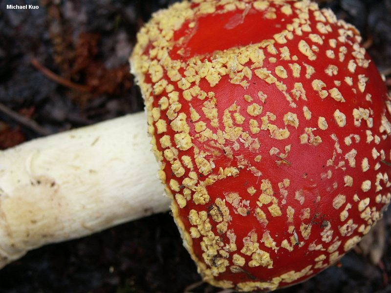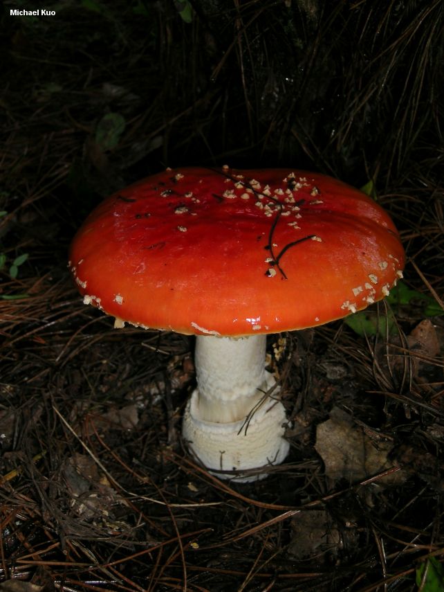The color of the cap in the muscaria group ranges from bright red (Amanita muscaria var. flavivolvata, described and illustrated here), to bright yellow (see Amanita muscaria var. guessowii), to white (Amanita muscaria var. alba). Compare Amanita muscaria with Amanita pantherina, which is brown and usually features a collar-like rim at the top of its bulb, rather than concentric zones--and with Amanita parcivolvata, which lacks a ring and has scattered flakes on its stem base, rather than concentric zones. The taxonomy of the Amanita muscaria species group will very likely change in the near future. A 2006 study by Geml and collaborators found DNA support for the idea that the color of the cap and warts in Amanita muscaria is not necessarily indicative of phylogenetic differences. The study used molecular dating techniques to hypothesize that "[t]he ancestral population of A. muscaria likely evolved in the Siberian-Beringian region and underwent fragmentation . . . The data suggest that these populations later evolved into species, expanded [sic] their range in North America and Eurasia" (225). As for the traditional morphological features separating "varieties," the researchers noted that among the species determined by DNA, "[a]ll . . . share at least two morphological varieties with other species, suggesting ancestral polymorphism in pileus and wart color pre-dating their speciations." Description: Ecology: Mycorrhizal with conifers and hardwoods (primarily oaks); summer and fall (and over winter in coastal California); fairly widely distributed in North America, but most common in the Pacific Northwest and Rocky Mountains (occasional--possibly introduced--in northeastern North America, apparently absent in the Midwest, rare in the southeastern United States, common in Mexico). Cap: 5-25 cm; nearly oval or round at first, becoming convex, then broadly convex to flat in age; bald; adorned with numerous small, cottony warts that are initially yellow but very quickly fade to white; deep to bright red, but sometimes fading with age to pale orange or pale yellow; the margin sometimes somewhat lined. Gills: Narrowly attached to the stem, or free from it; white; close or crowded; short-gills frequent. Stem: 5-18 cm long; 1-3 cm thick; more or less equal, or tapering to apex; with a swollen base; bald or shaggy; white; with a high, skirtlike ring; with concentric bands of universal veil material at the top of the bulb and/or on the lower stem. Flesh: White throughout; unchanging when sliced. Odor: Not distinctive. Spore Print: White. Microscopic Features: Spores 8-12 x 5-7 µ; smooth; broadly ellipsoid; inamyloid. Basidia 4-spored; clamped. Pileipellis an ixocutis of hyphae 2-9 µ wide. Lamellar trama bilateral; subhymenium ramose. REFERENCES: (Singer, 1958) Jenkins, 1977. (Smith, 1975; Smith, Smith & Weber, 1979; Thiers, 1982; Weber & Smith, 1985; Arora, 1986; Jenkins, 1986; States, 1990; Phillips, 1991/2005; Lincoff, 1992; Metzler & Metzler, 1992; Evenson, 1997; Barron, 1999; Geml et al., 2006; Miller & Miller, 2006; Binion et al., 2008; Trudell & Ammirati, 2009; Tulloss, 2013.) Herb. Kuo 08170308, 01131109. This site contains no information about the edibility or toxicity of mushrooms. |