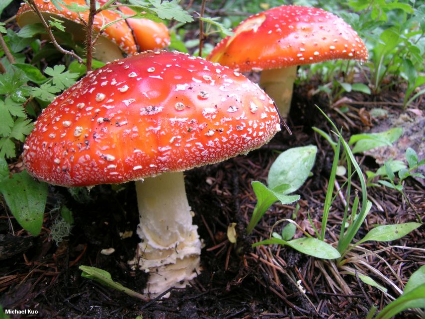 Amanita muscaria var. flavivolvata [ Basidiomycetes > Agaricales > Amanitaceae > Amanita . . . ] by Michael Kuo This is our continent's version of the classic Eurasian "toadstool," Amanita muscaria, which is probably the most depicted and recognized mushroom on earth--a fact in evidence even by my spelling checker's lack of objection to the species name; this almost never happens with fungi. To me, Amanita muscaria looks like those cut-out lawn decorations featuring an old farm woman in a polka-dotted dress bending over to tend flowers. Whatever it looks like to you, you'll probably agree that it is gorgeous. Our North American variety (or "subspecies," if you prefer) is distinguished by the fact that its universal veil and warts are yellow at first, though they quickly fade to white when exposed to sunlight--and by microscopic features. The defining features of the Amanita muscaria species group are: